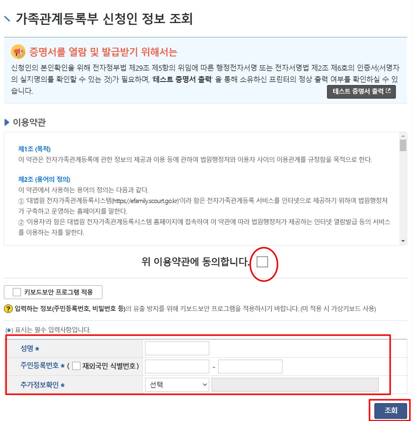 4. "가족관계등록부 신청인 정보 조회"에서 "동의합니다" 누르시고, 아래의 성명, 주민등록번호, 추가정보확인란을 채워서 입력합니다. 그리고 "조회" 누릅니다.