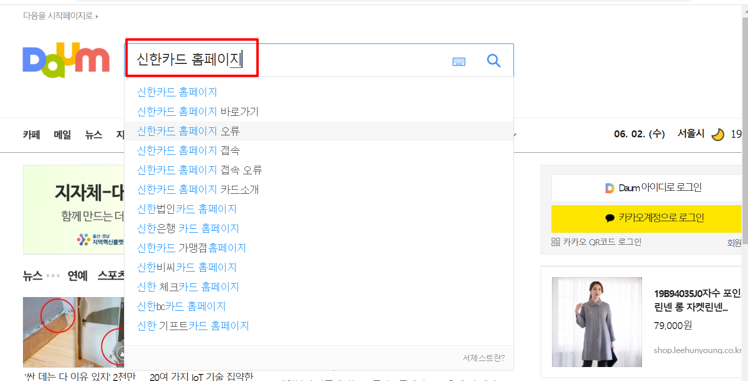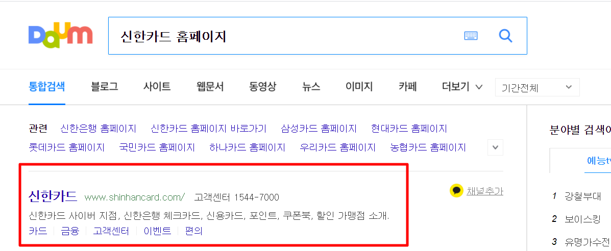 1. 다음(daum)검색창에 "신한카드 홈페이지 바로가기"를 검색합니다.