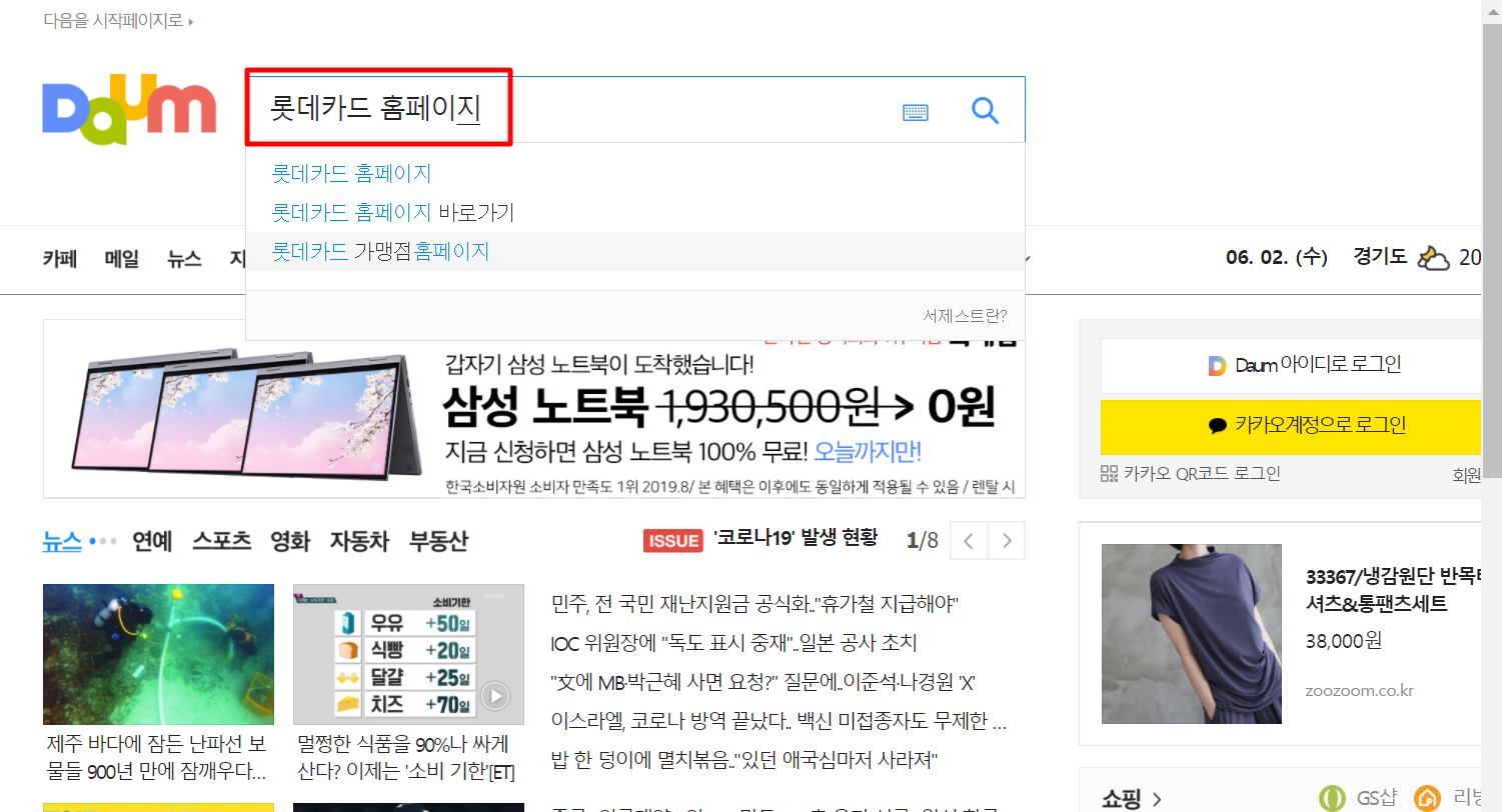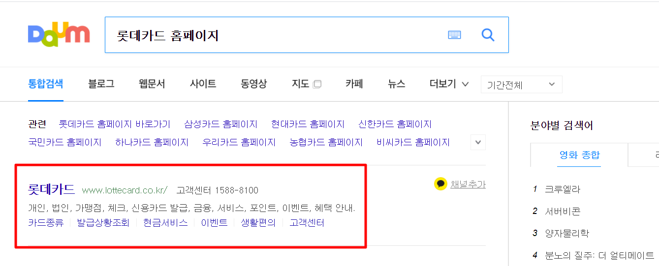 1. 다음(daum)검색창에 "롯데카드 홈페이지 바로가기"를 검색합니다.