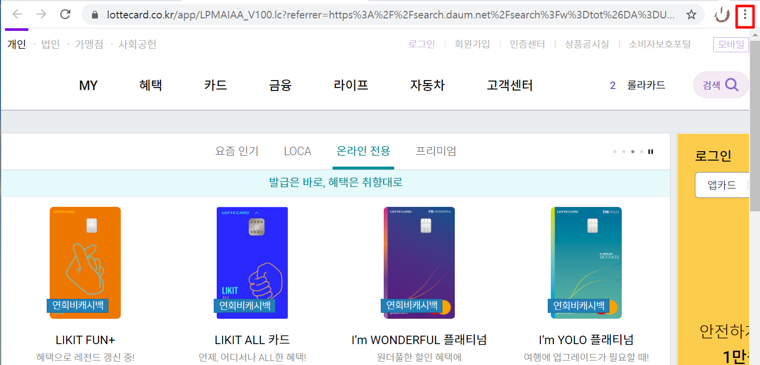 3. "롯데카드 홈페이지" 에 접속하여 오른쪽 상단에 보시면 "점 3개"를 누릅니다.