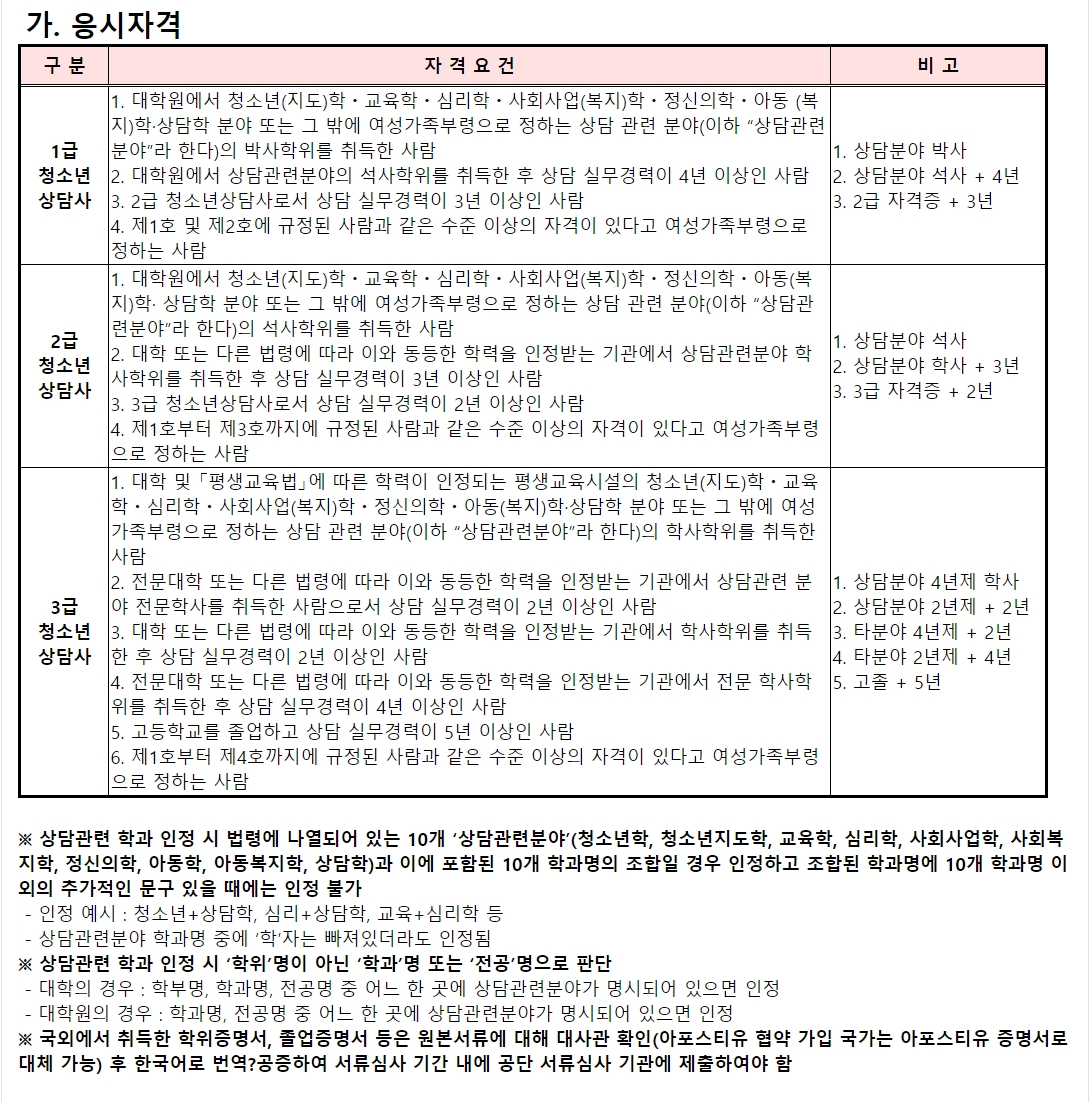 청소년상담사는 1급, 2급, 3급이 있습니다. 각 급수마다 응시자격이 다르니,