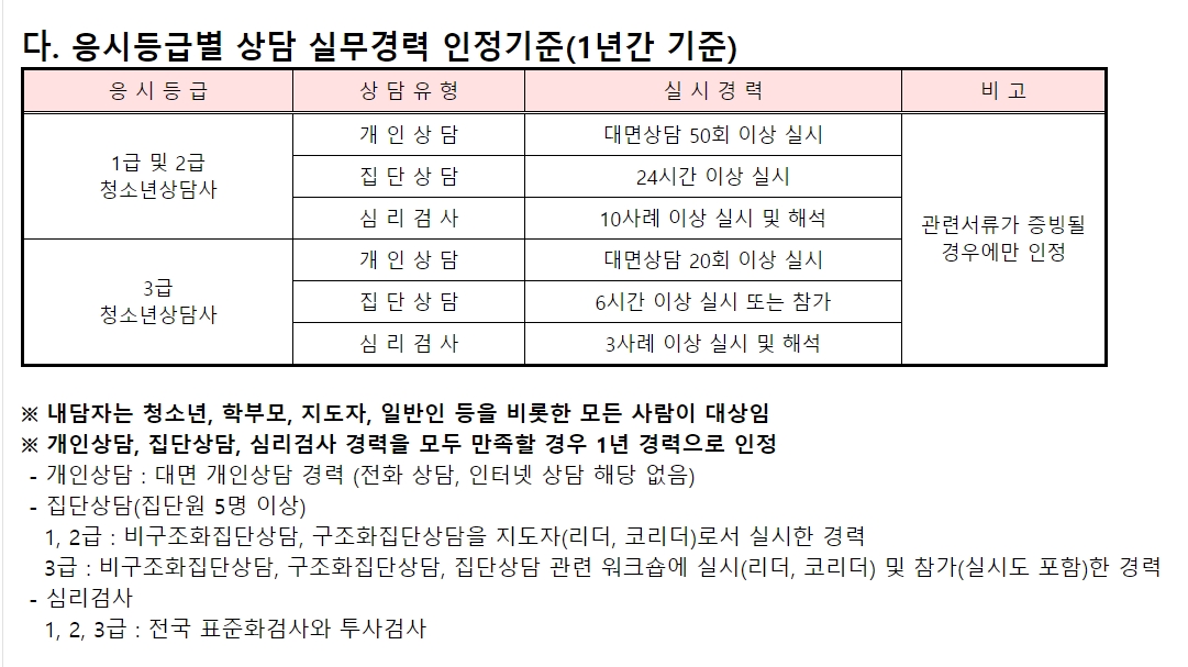 청소년상담사 응시 등급별 상담 실무경력 인정기준입니다.
