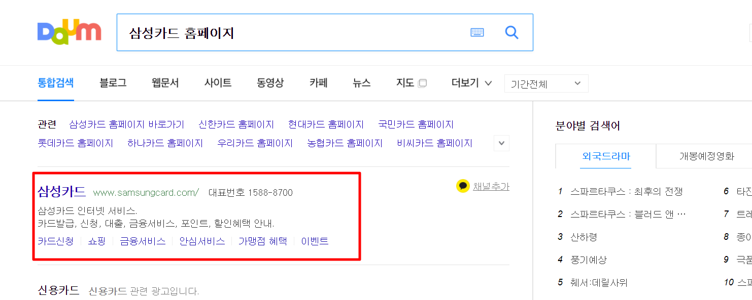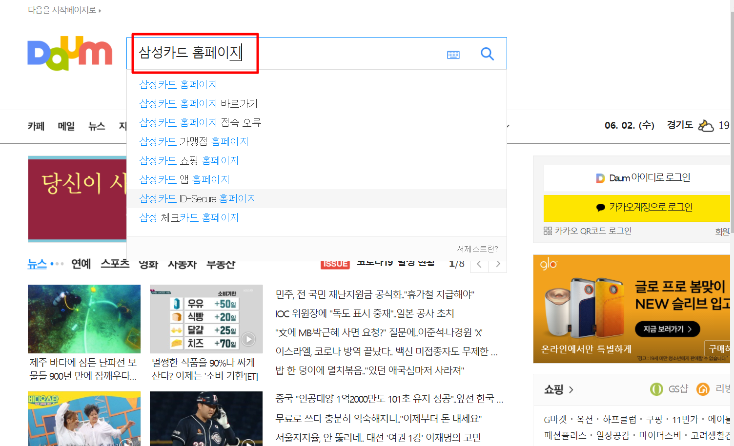 1. 다음(daum)검색창에 "삼성카드 홈페이지 바로가기"를 검색합니다.