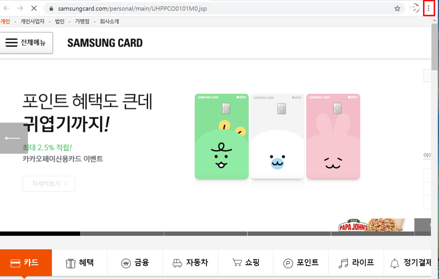 3. "삼성카드" 사이트에 접속하여 오른쪽 상단에 보시면 "점 3개"를 누릅니다.