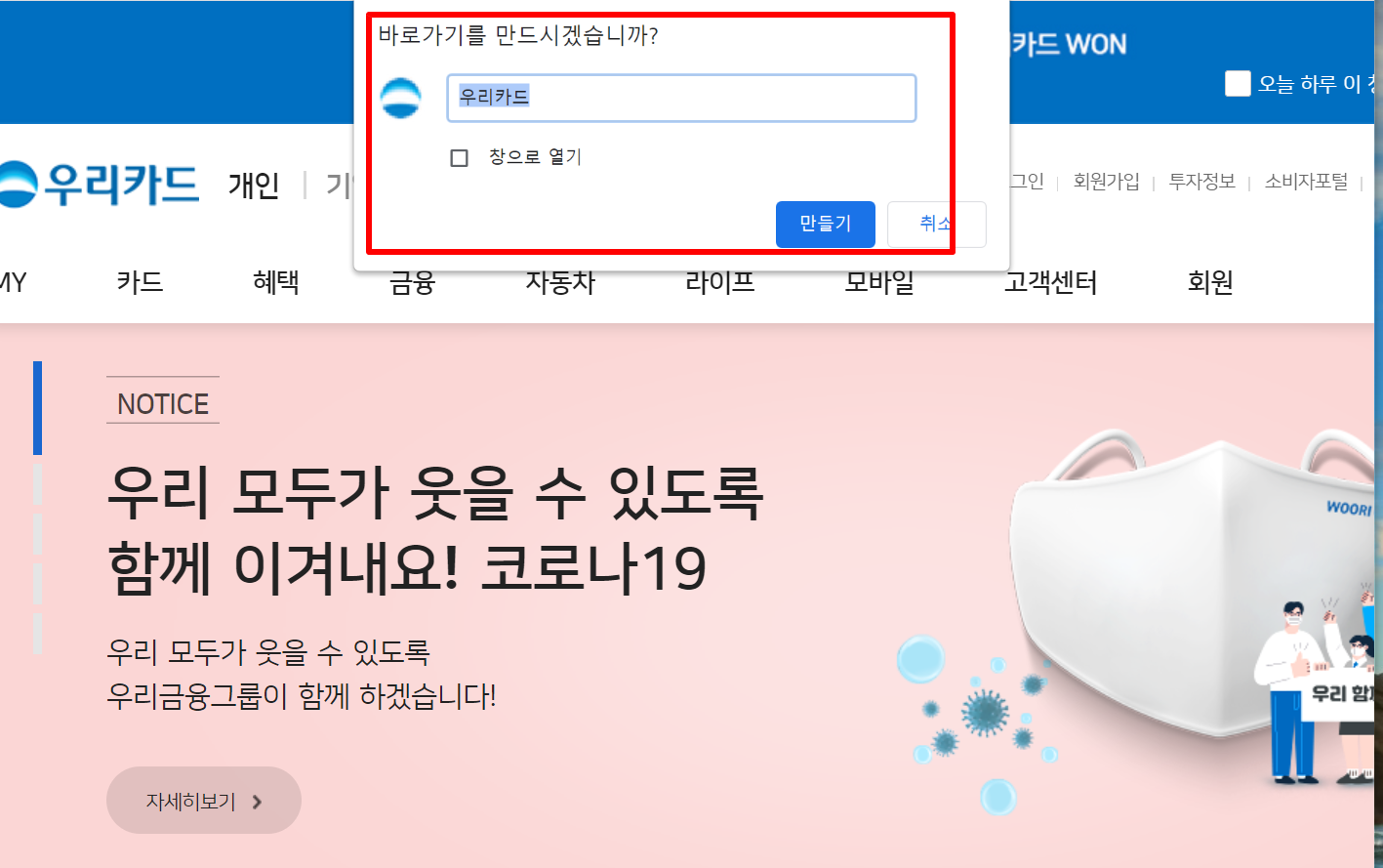 5. "바로가기를 만드시겠습니까"라고 뜨면 우리카드 홈페이지 이름으로 하시고 만들기 누릅니다. 이름은 원하시는 것으로 하시면 됩니다.