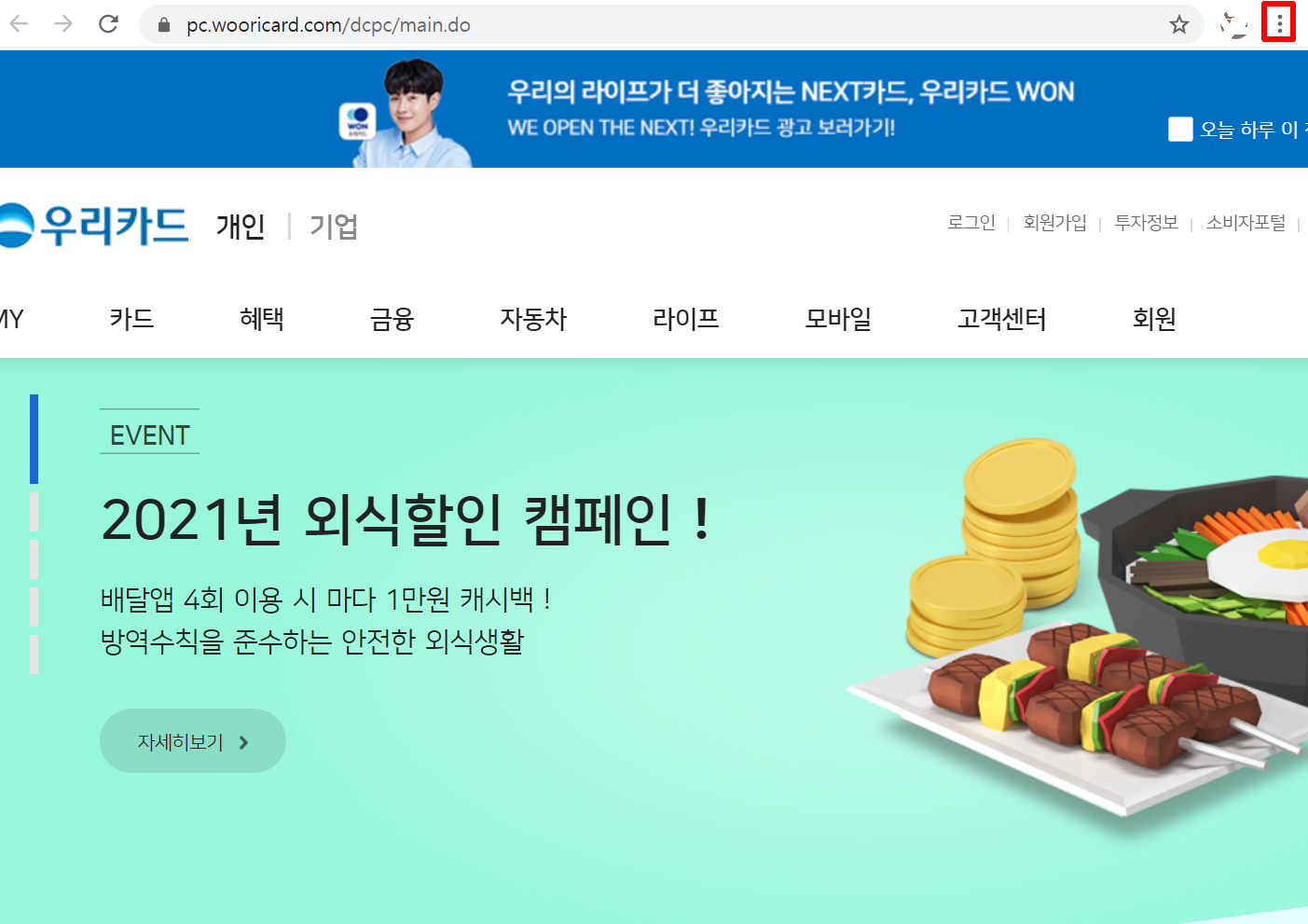 3. "우리카드 홈페이지에 접속하여 오른쪽 상단에 보시면 "점 3개"를 누릅니다.
