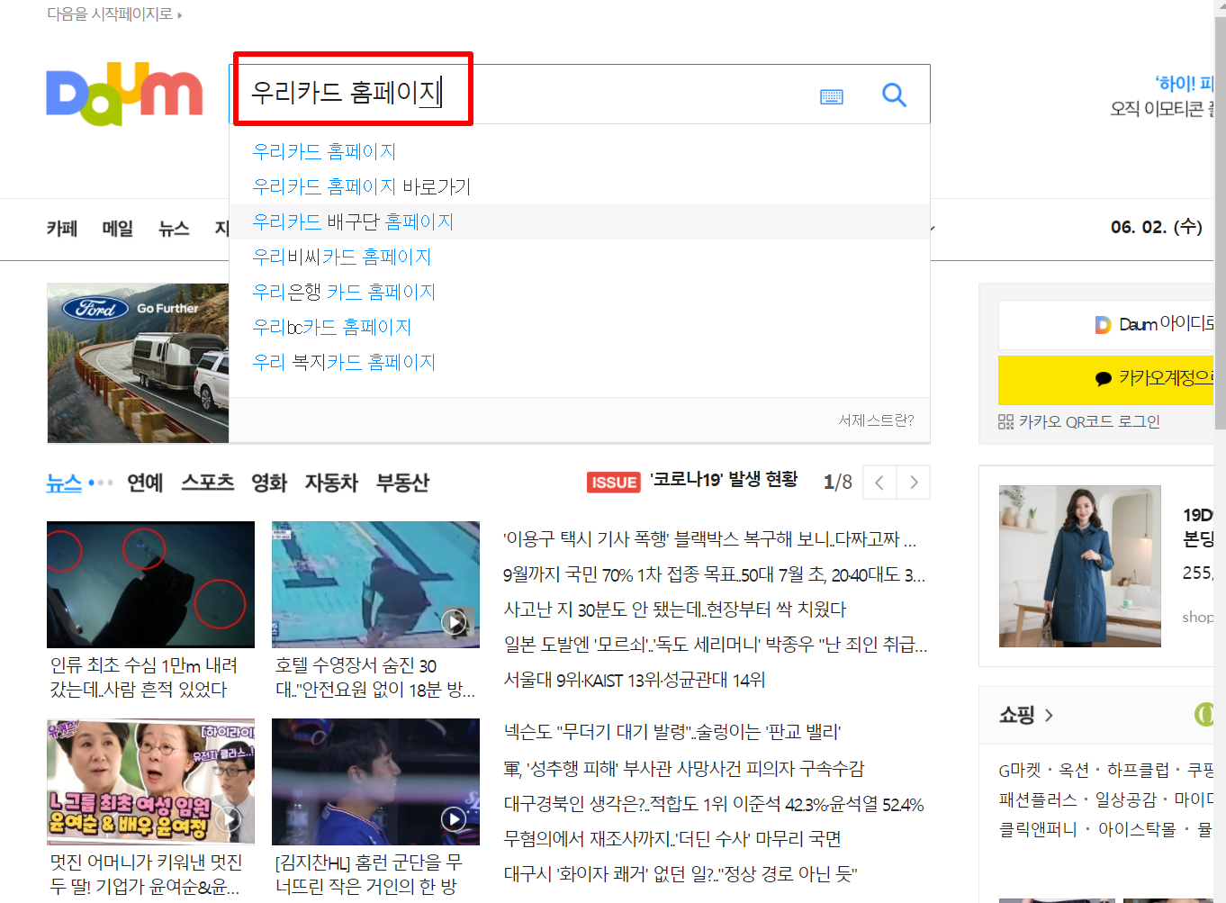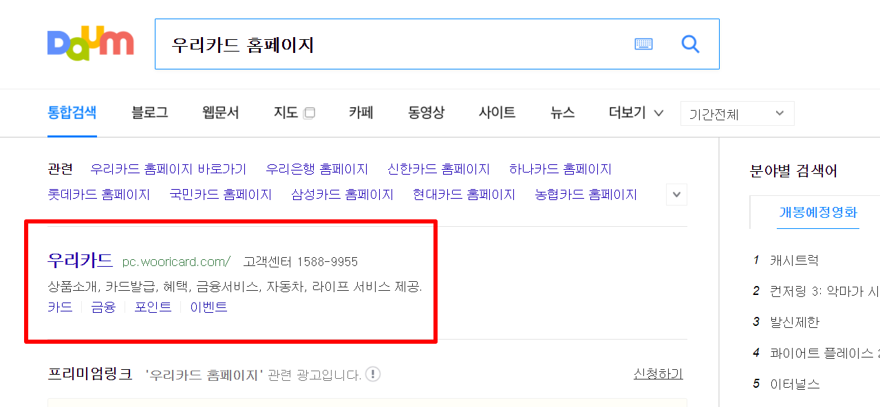 1. 다음(daum)검색창에 " 우리카드 홈페이지"를 검색합니다.
