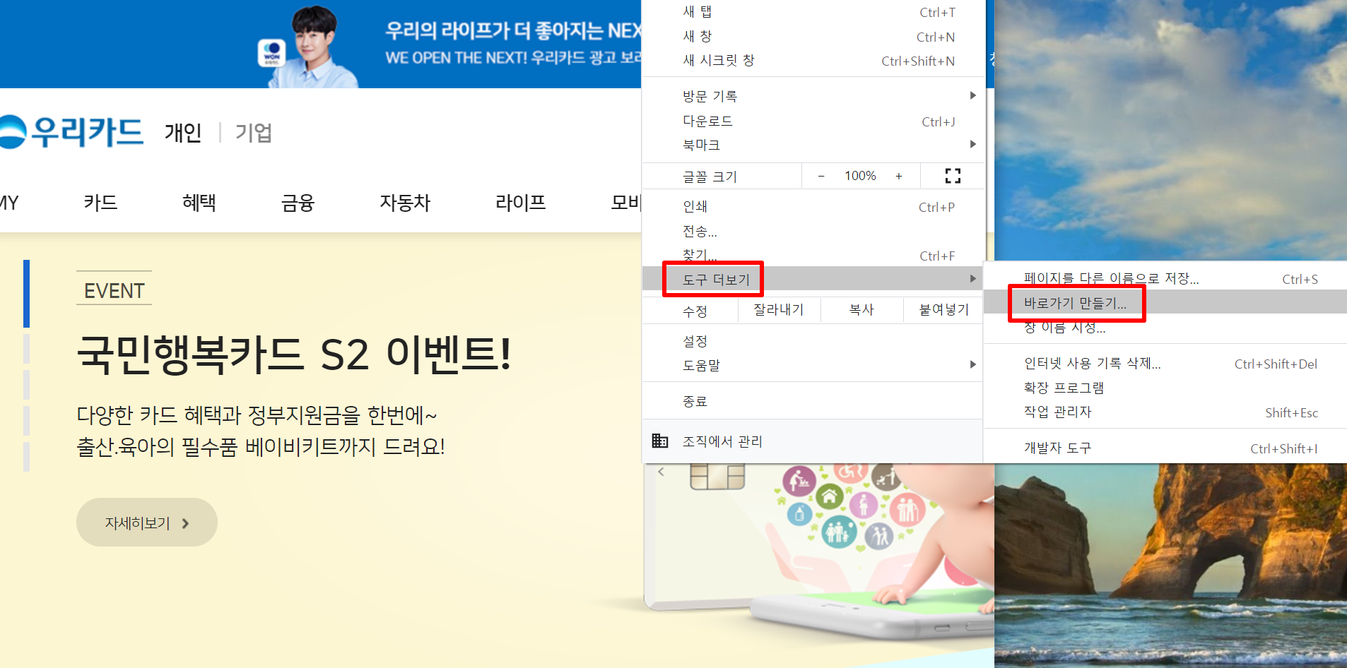 5. "바로가기를 만드시겠습니까"라고 뜨면 우리카드 홈페이지 이름으로 하시고 만들기 누릅니다. 이름은 원하시는 것으로 하시면 됩니다.