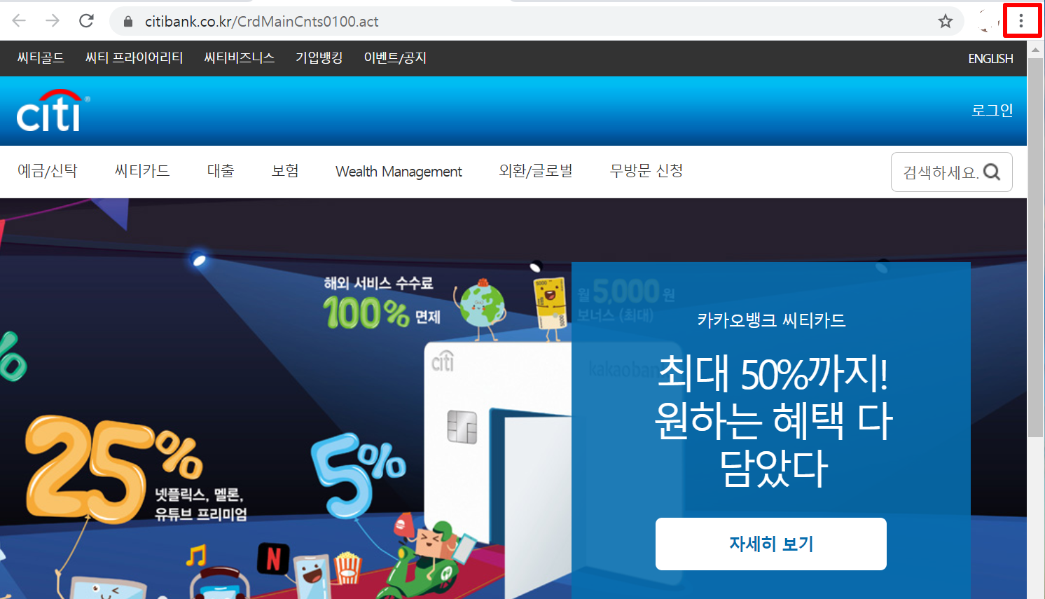 3. "씨티카드 홈페이지에 접속하여 오른쪽 상단에 보시면 "점 3개"를 누릅니다.