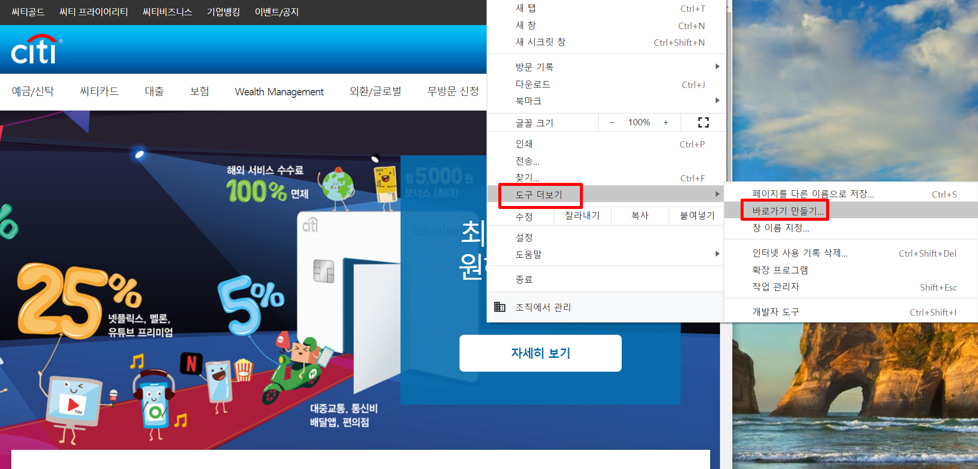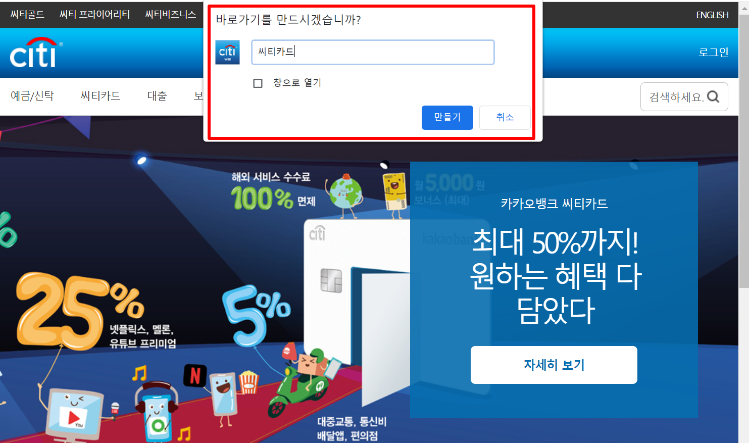 5. "바로가기를 만드시겠습니까" 라고 뜨면 씨티카드 홈페이지로 하셔도 되고, 아니면 원하는 시는 이름으로 하시면 됩니다.