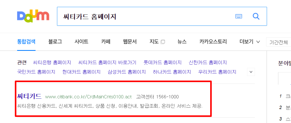 1. 다음(daum)검색창에 "씨티카드 홈페이지 바로가기"를 검색합니다.