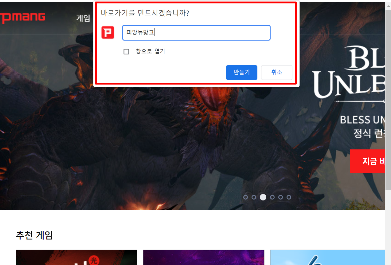 5. "바로가기를 만드시겠습니까"라고 뜨면 피망뉴맞고 라고 이름을 적으시고 만들기를 하시면 됩니다. 이름은 본인이 원하는 것으로 하셔도 됩니다.