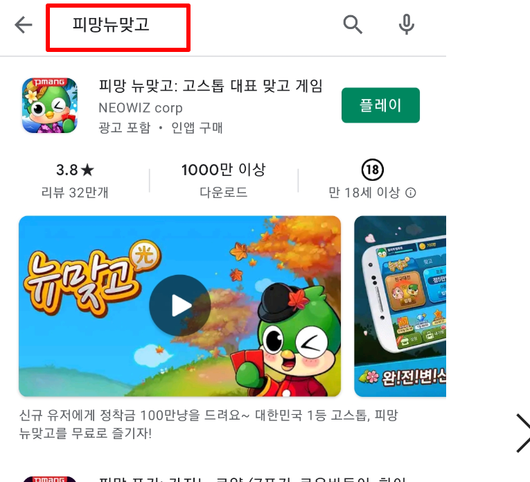 2. 검색창에 "피망뉴맞고"라고 적으시고 검색을 하시면 "피망뉴맞고"어플이 뜹니다. 설치를 누르셔서 설치하시면 됩니다.