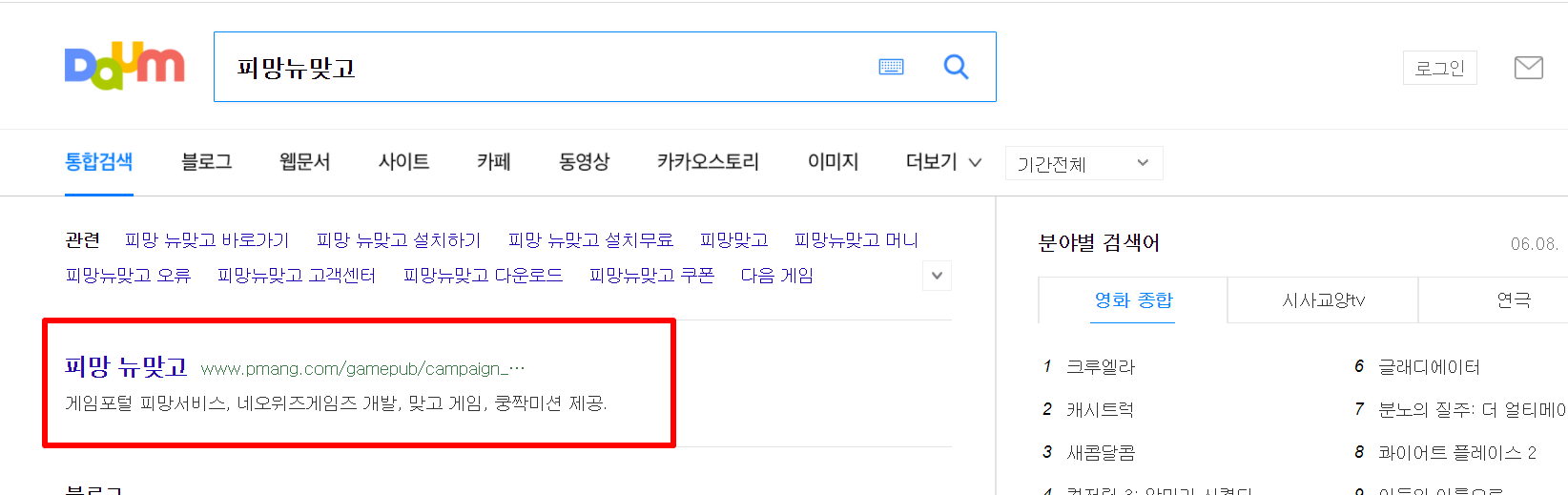 1. 다음(daum)검색창에 "피망뉴맞고 바로가기"를 검색합니다.