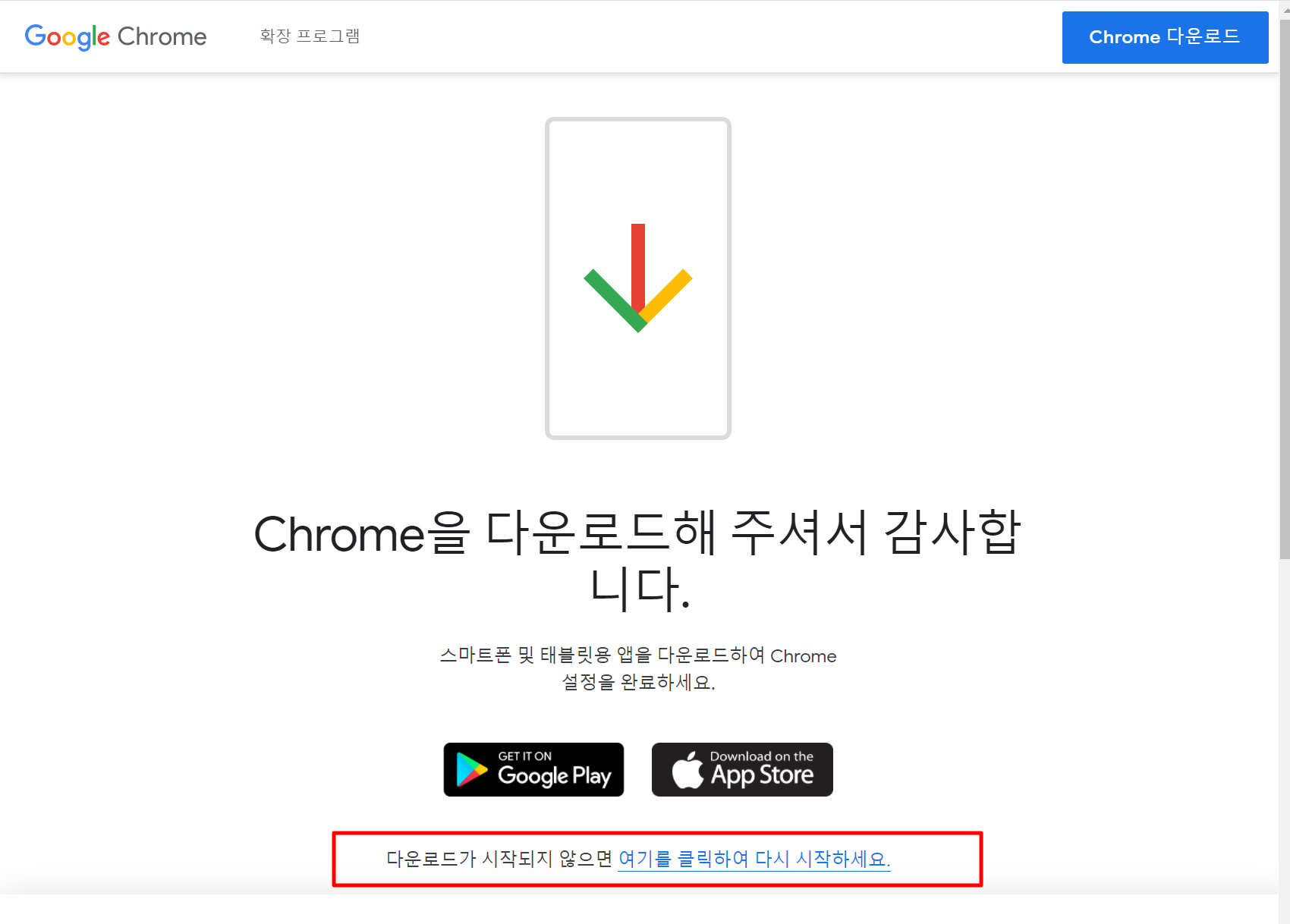 1. 그림 아래를 제일 하단을 보시면 "다운로드가 시작되지 않으면 여기를 클릭하여 다시 시작하세요"라는 항목이 보입니다. 구글 크롬 다운로드 안될 때 누르십니다.