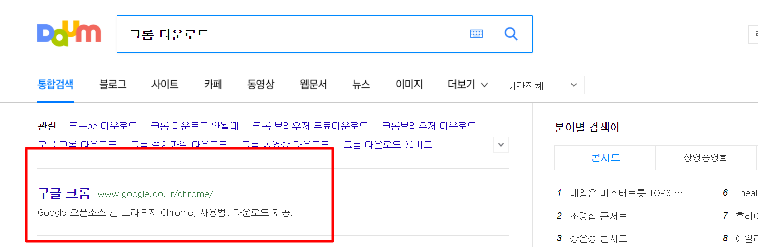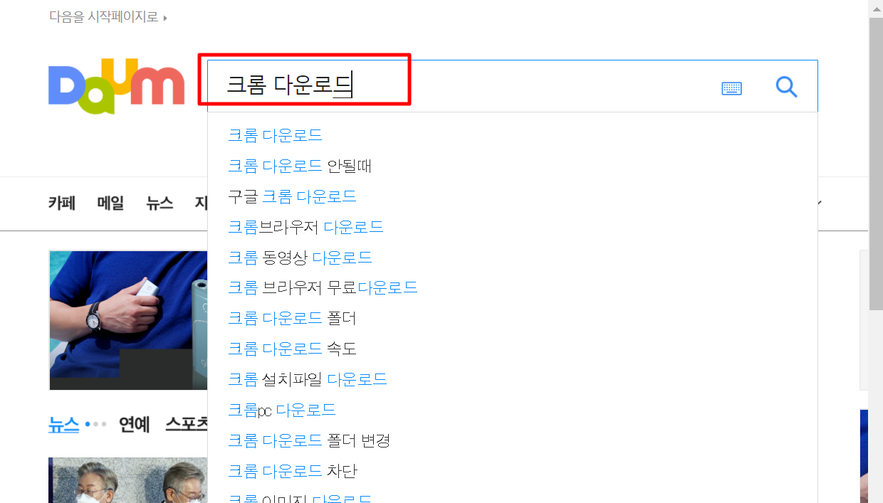 1. 다음(daum) 검색창에 "구글 크롬 다운로드"를 검색합니다.