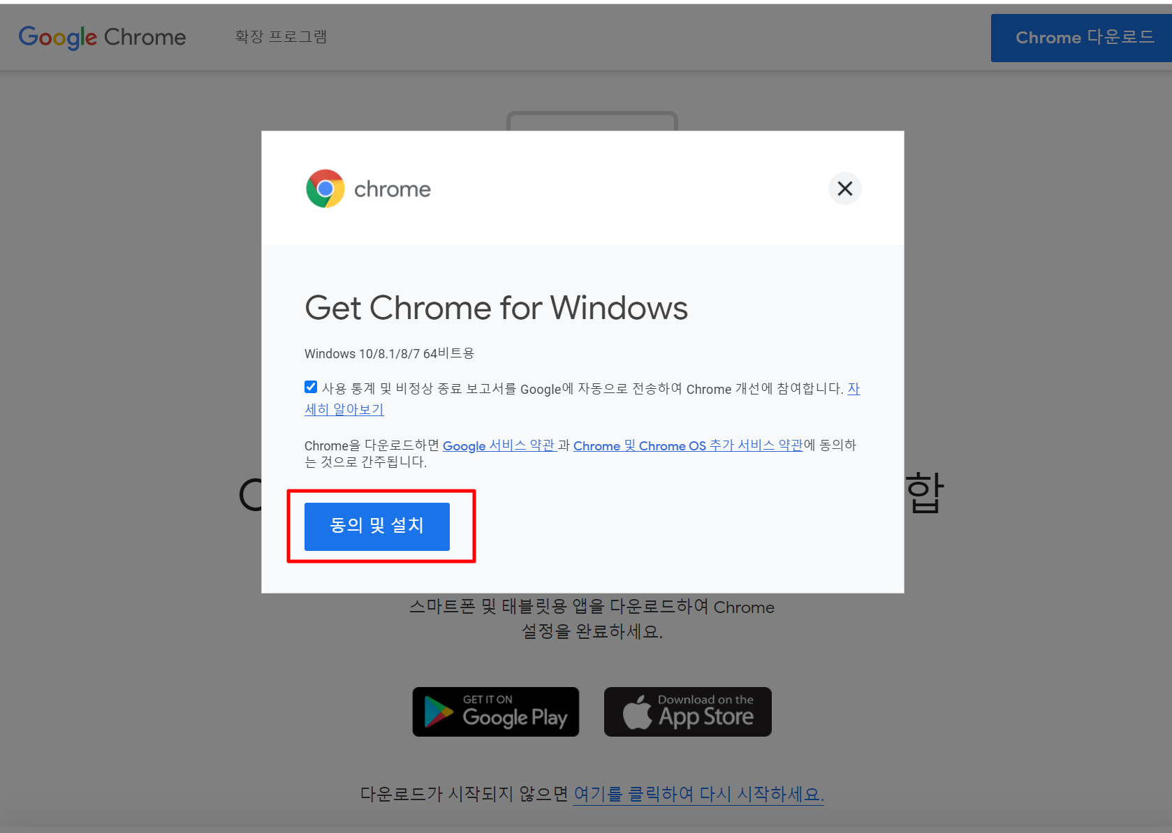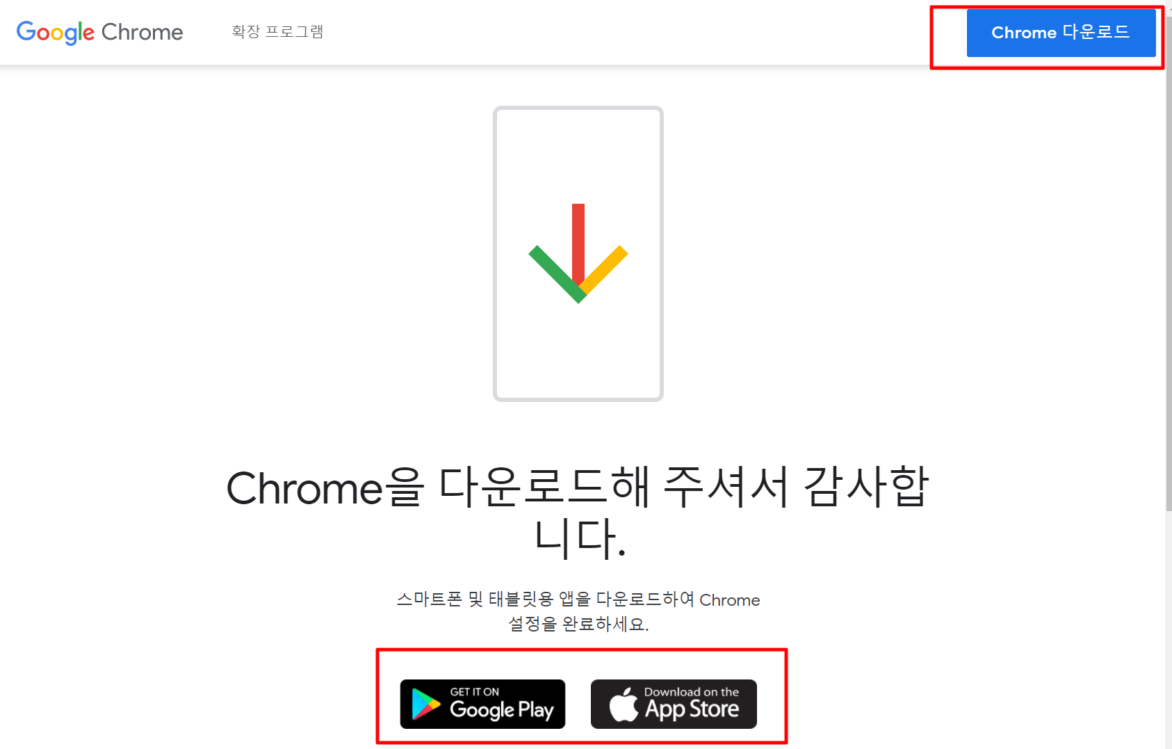 4. 크롬 다운로드를 하시면 다운로드해 주셔서 감사합니다.라는 문구가 뜹니다. 그리고 그 아래에 스마트폰 및 태블릿용 앱을 다운로드하실 수 있는 구글 플레이어와 앱 스토어가 있습니다.
