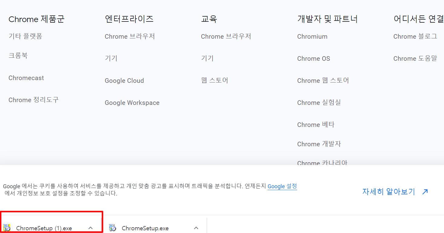 1. 그림 아래를 제일 하단을 보시면 "다운로드가 시작되지 않으면 여기를 클릭하여 다시 시작하세요"라는 항목이 보입니다. 구글 크롬 다운로드 안될 때 누르십니다.