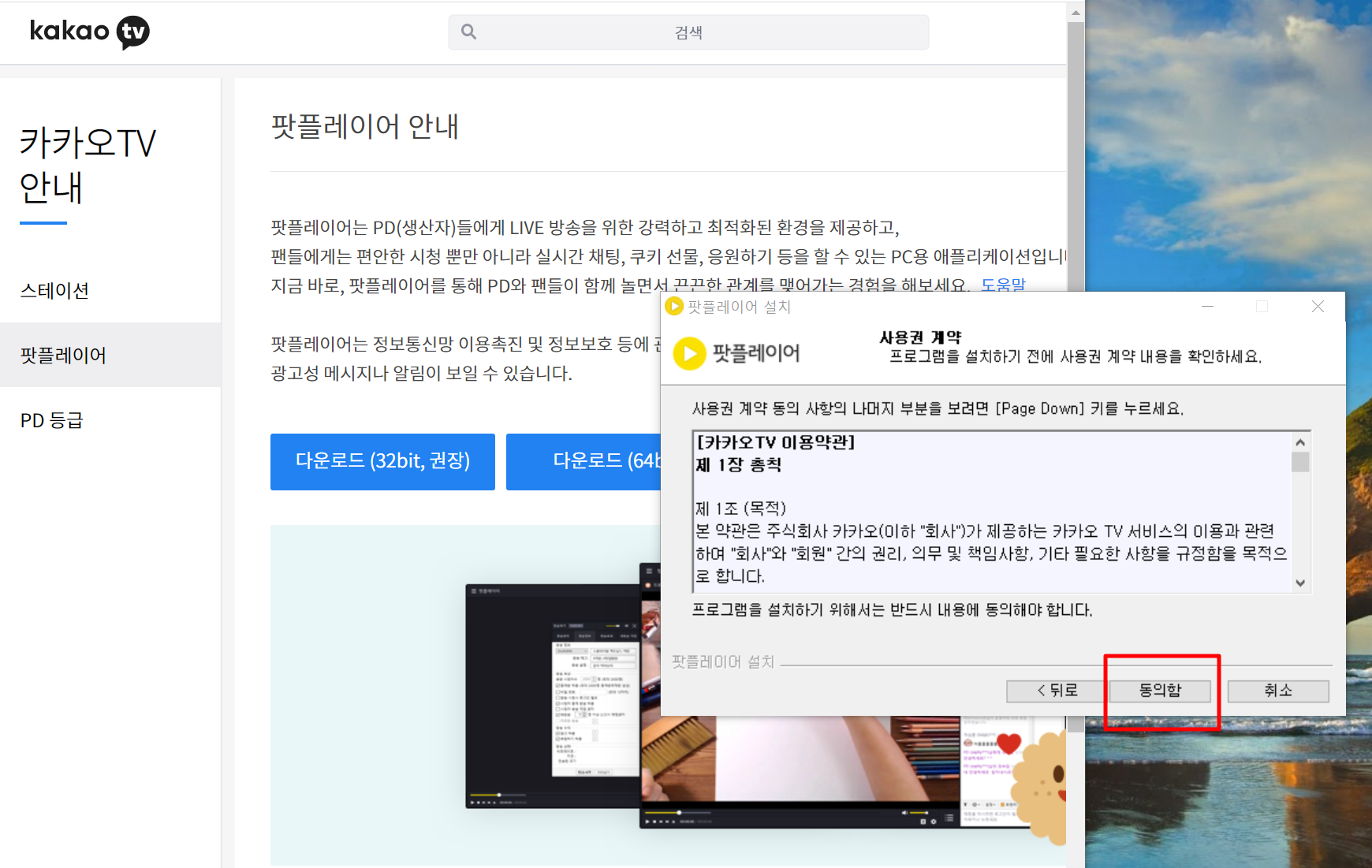 6. 다음팟플레이어 카카오tv이용약관이 뜨면은 동의함을 누릅니다.