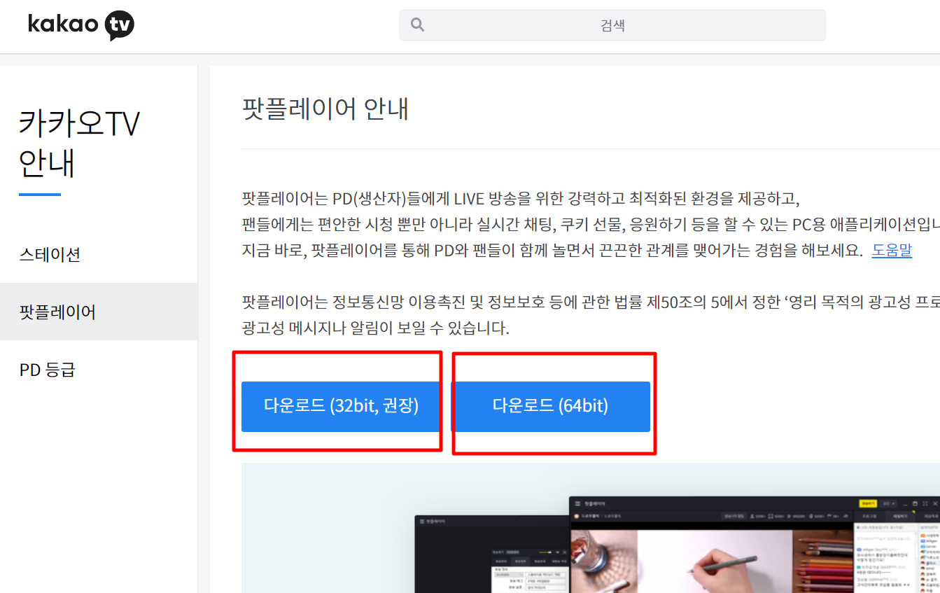 3. "다음팟플레이어" 홈페이지에 접속하시면 다운로드 32비트, 다운로드 64비트가 보입니다. 32비트를 권장하는데요. 먼저 32비트로 다운로드를 해보도록 하겠습니다.