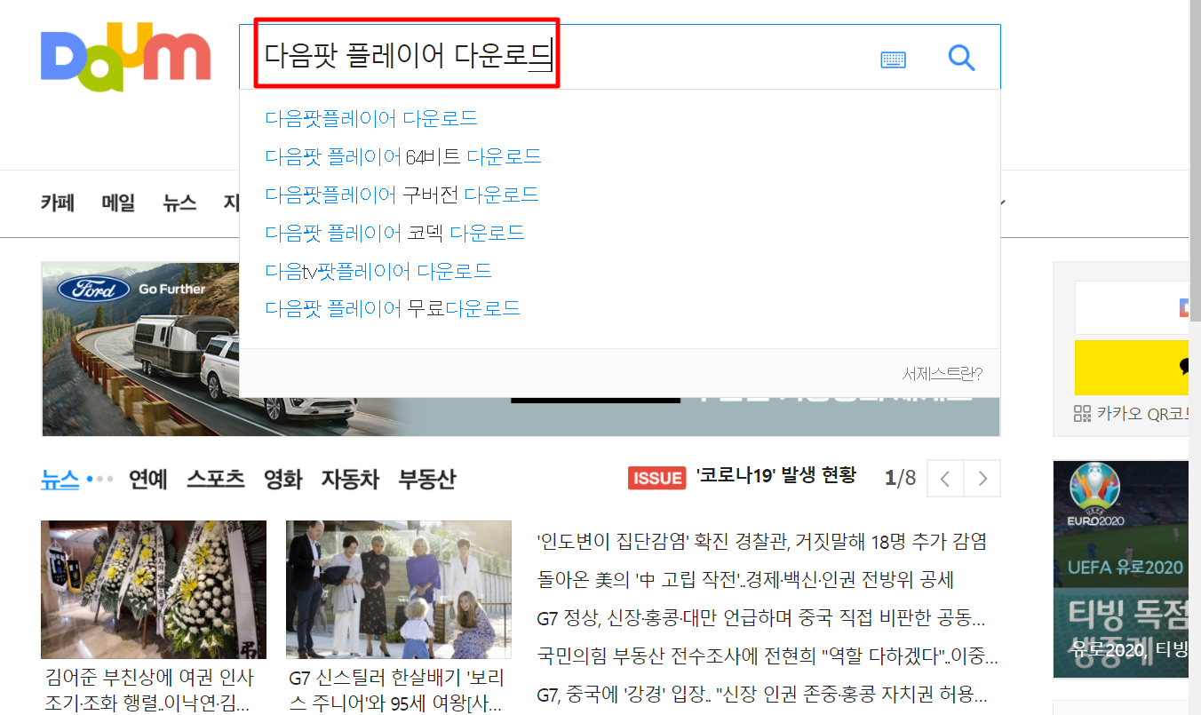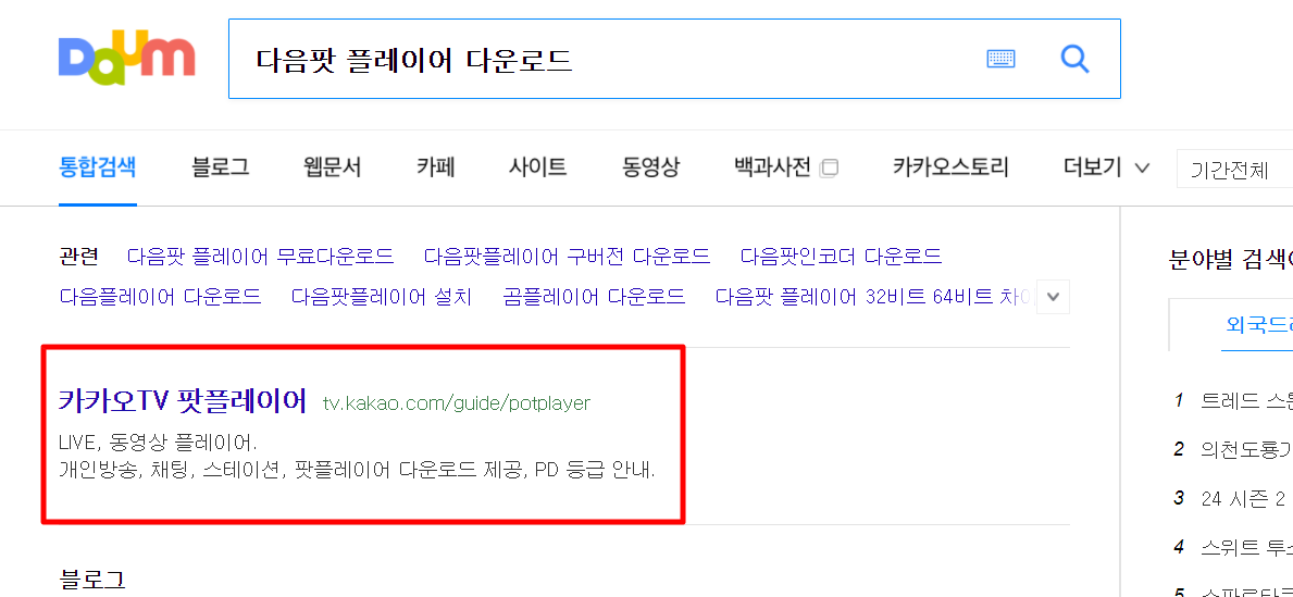 1. 다음(daum) 검색창에 "다음팟플레이어 다운로드"를 검색합니다.