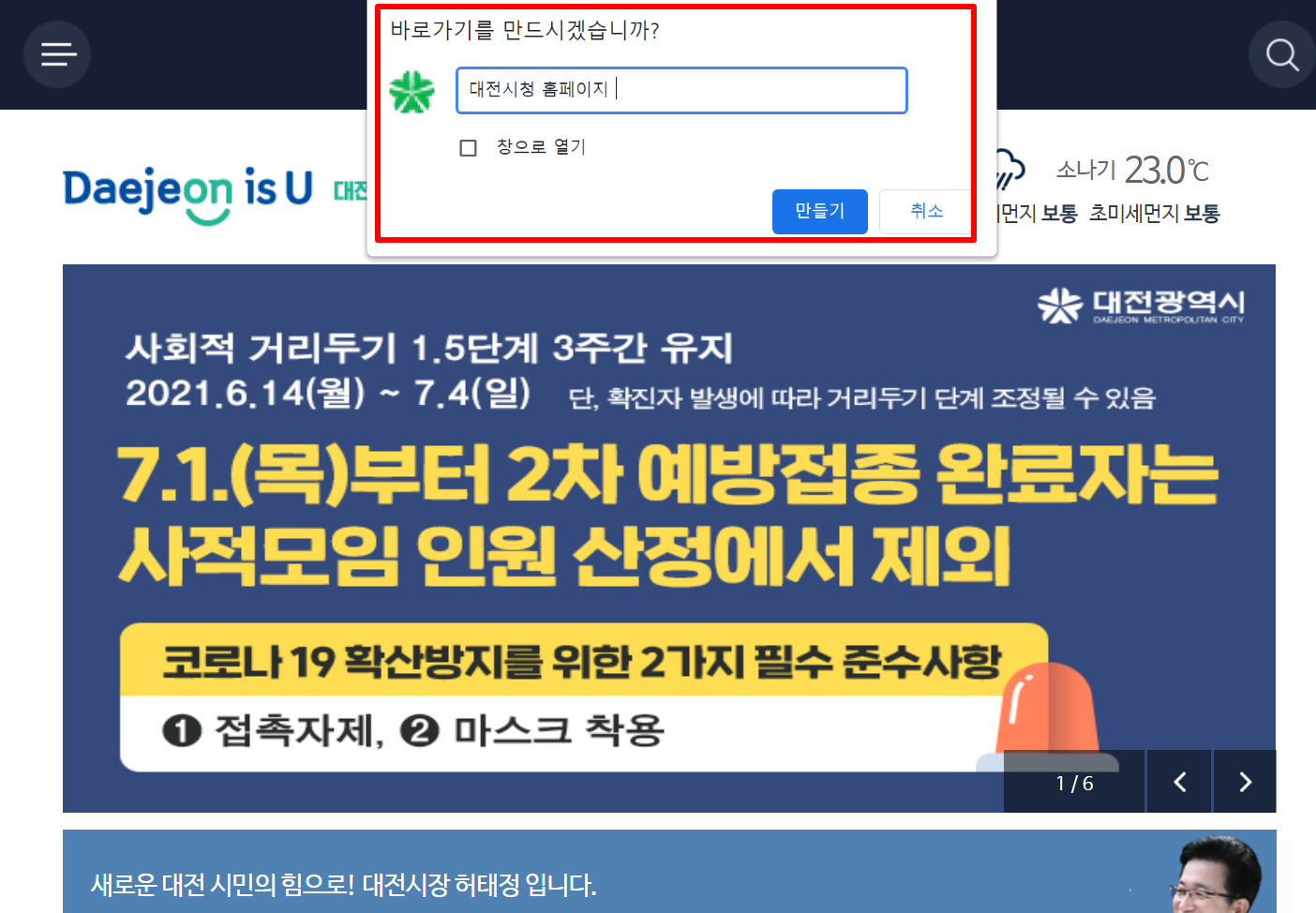 6. "바로가기를 만드시겠습니까" 라고 뜨면 대전시청 홈페이지라고 적으셔서 만들기를 합니다. 원하시는 이름으로 하셔도 됩니다.