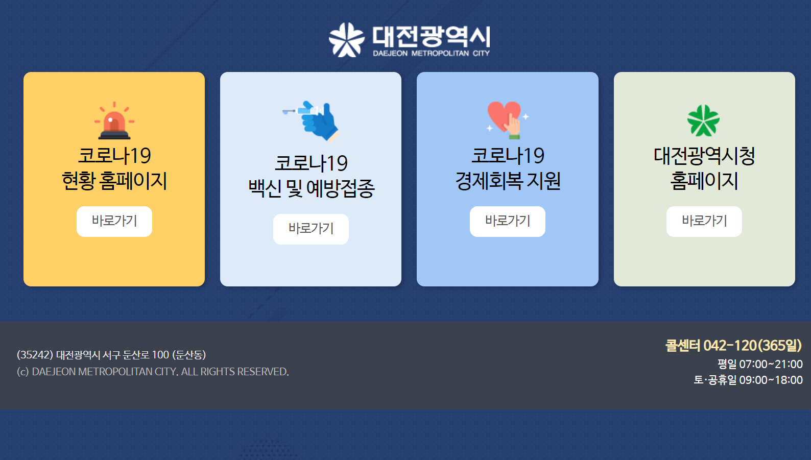 3. "대전시청 홈페이지" 에 접속하시면 메인화면에 "코로나19 현황 홈페이지" "코로나19 백신 및 예방접종" "코로나19 경제회복 지원" "대전시청 홈페이지 바로가기"가 있습니다. 여기서 대전시청 홈페이지 바로가기를 누르십니다.