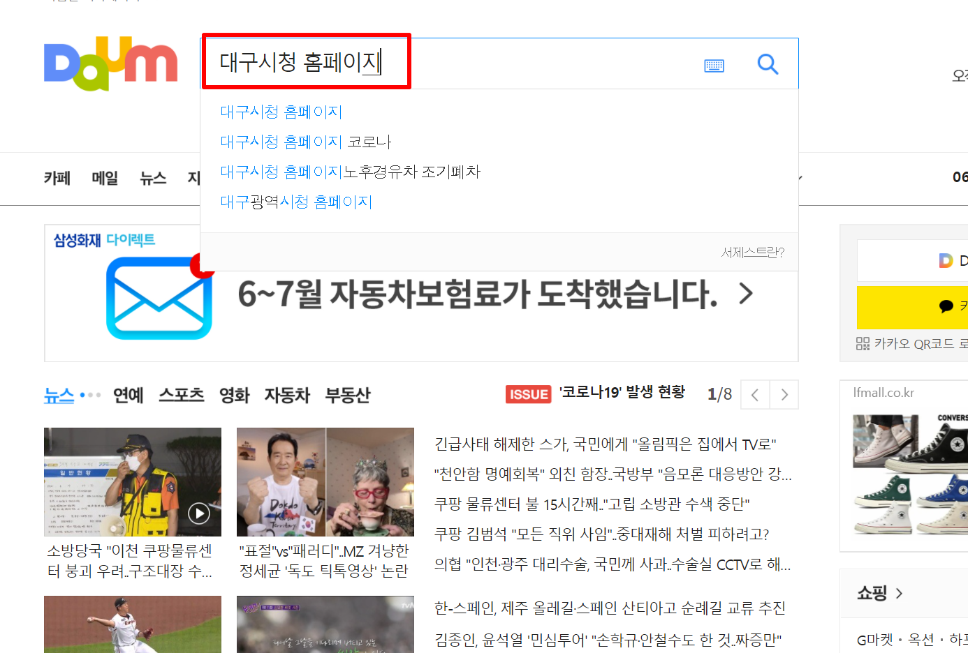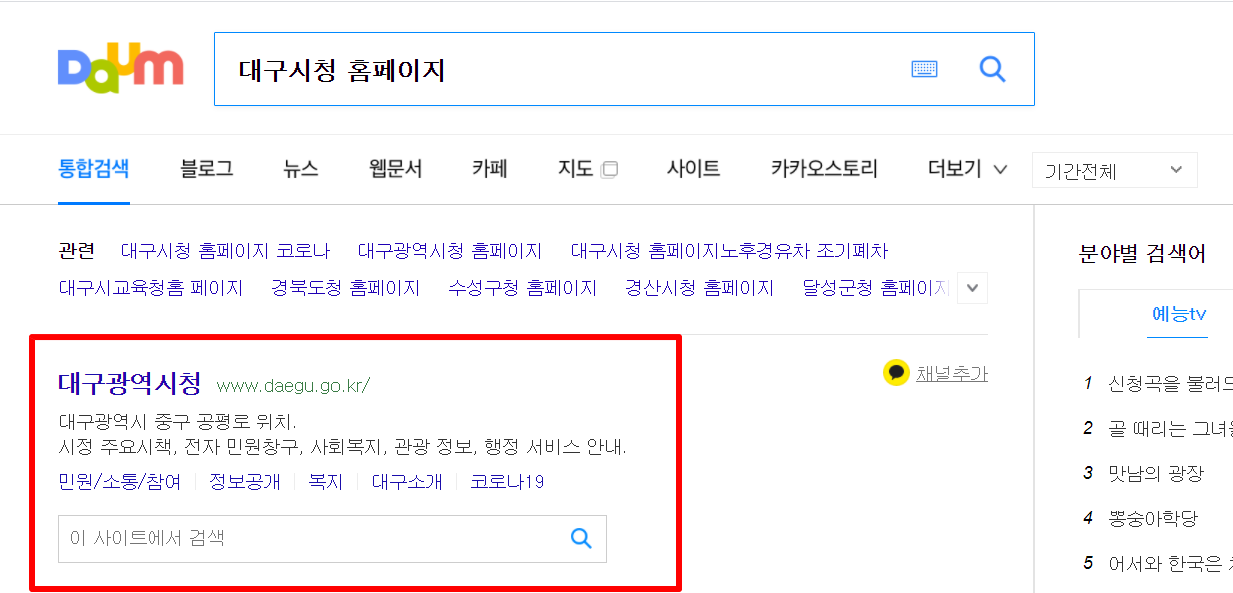 1. 다음(daum)검색창에 "대구시청 홈페이지 바로가기"를 검색합니다.
