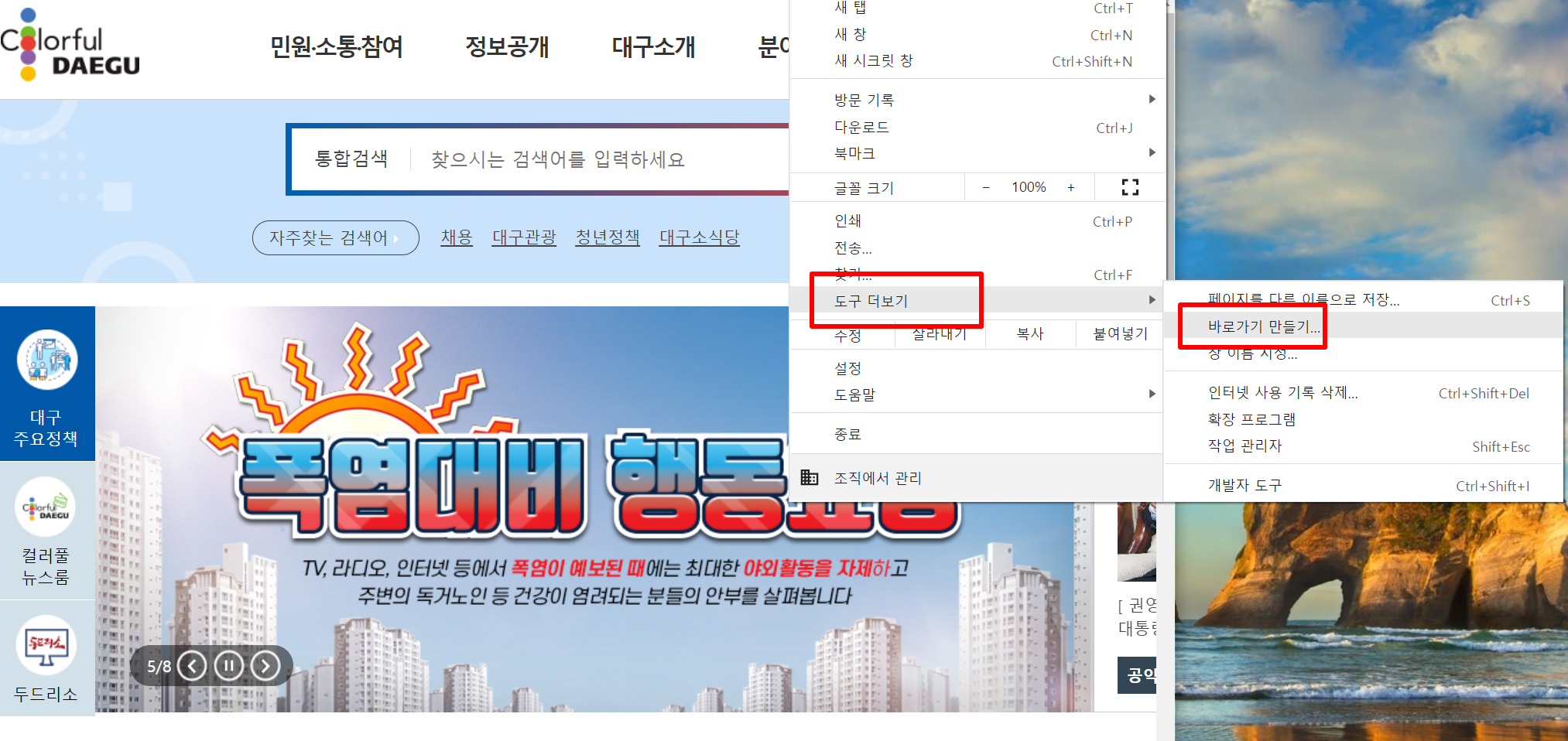 7. 바탕화면에 대구시청 홈페이지 아이콘이 생성됩니다. 대구시청 홈페이지 아이콘만 누르시면 대구시청 홈페이지에 바로 접속하실 수 있습니다. 그리고 대구시청 주요 시책, 전자 민원 창구, 사회복지, 관광 정보, 행정 서비스 안내등을 이용하실 수 있습니다.