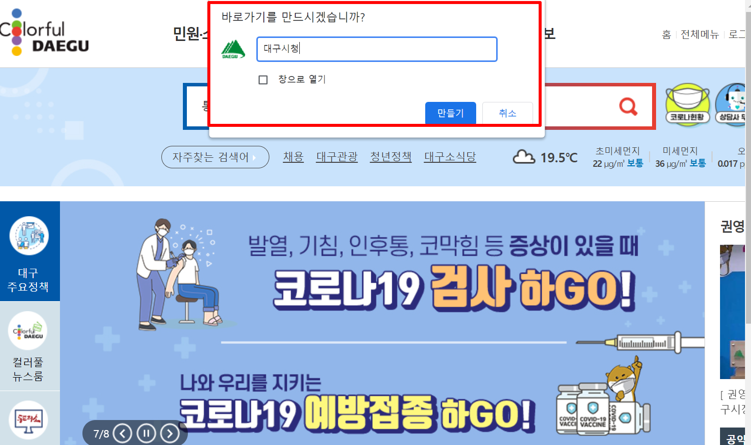 6. "바로가기를 만드시겠습니까" 라고 뜨면 대구시청을 입력하시고 만들기를 누릅니다. 이름은 본인이 원하는 것으로 하셔도 됩니다.