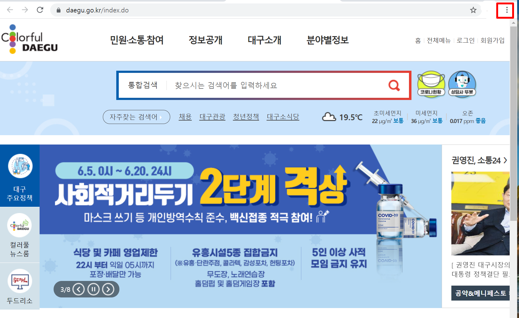 4. 대구시청 홈페이지에 접속하셔서 우측 상단에 보시면 점3개가 세로로 찍혀 있는 것을 보실 수 있습니다. 그것을 누르십니다.
