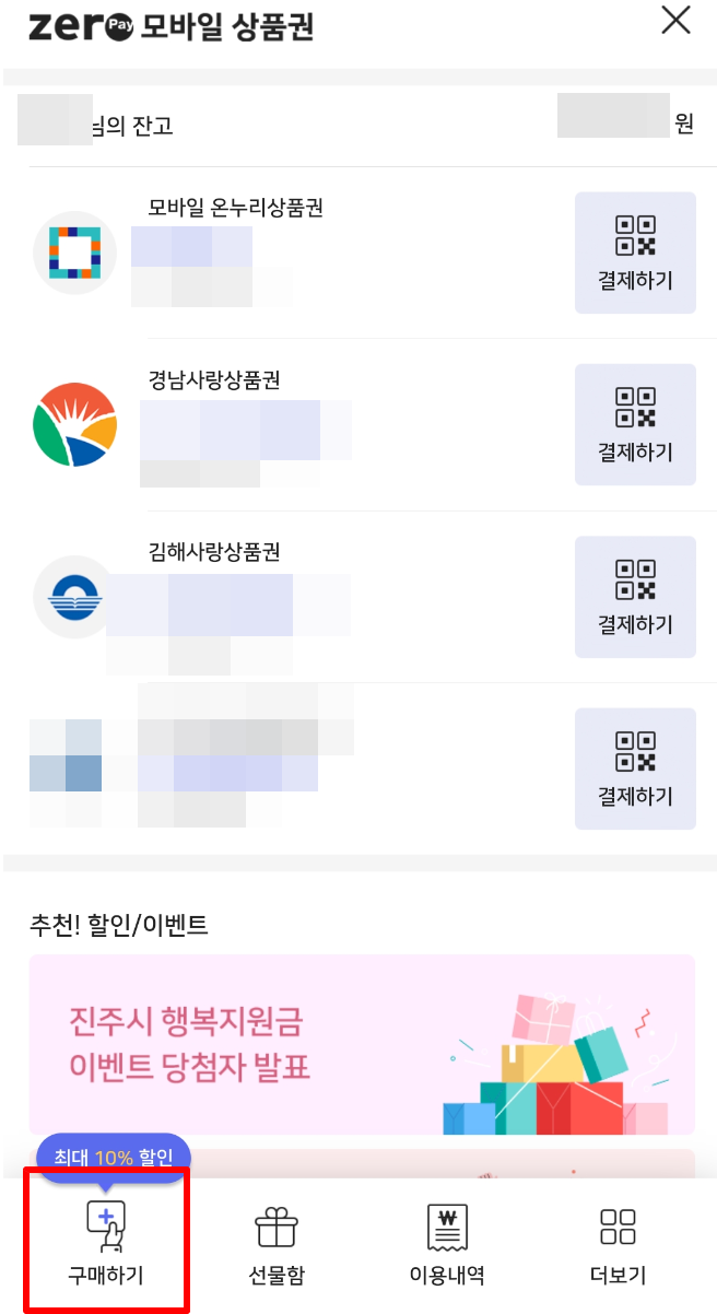 2. 각 지역의 상품권을 구매하셨으면은 잔액이 표시가 됩니다. 오른쪽에 있는 결제하기를 누르십니다.