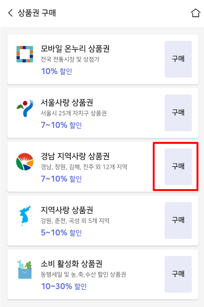 4. 경남사랑상품권 구매는 "경남지역사랑상품권" 옆에 있는 구매를 누르십니다.