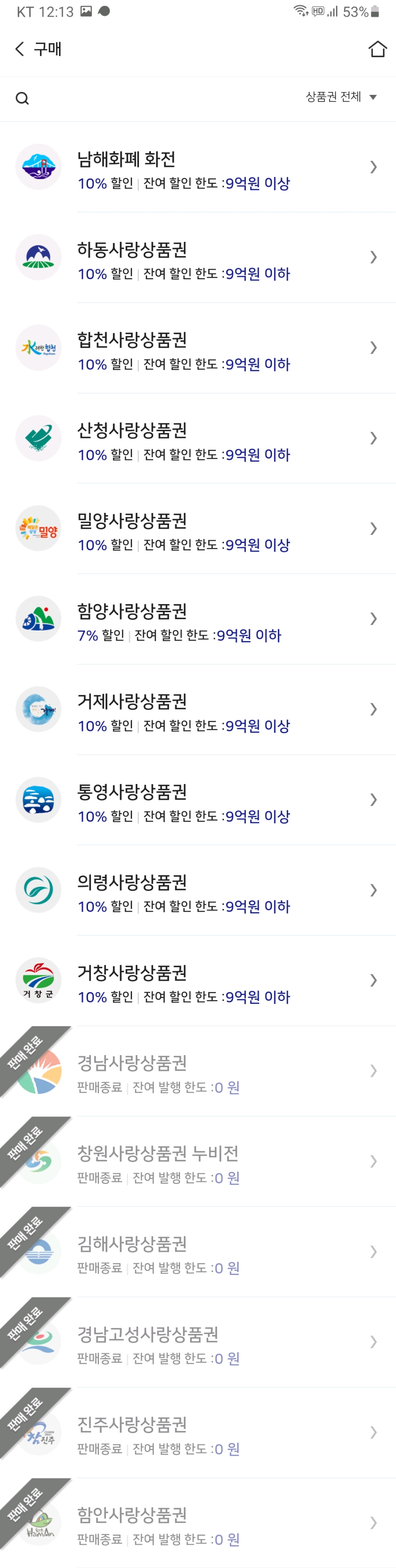 5. 여러 경남지역의 지역사랑상품권이 뜨는데요. "경남사랑상품권"을 누려셔서 구매하시면 됩니다. 각 지역의 할인율과 잔여 할인 한도도 표시가 되어 있는것을 확인하실수 있습니다.