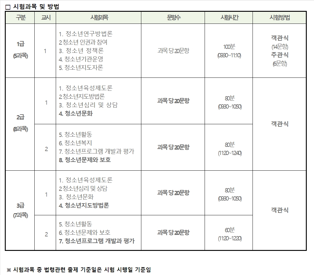 청소년지도사 시험과목1급 5과목, 2급 8과목, 3급 7과목으로 문항수는 과목당 20문제이다.