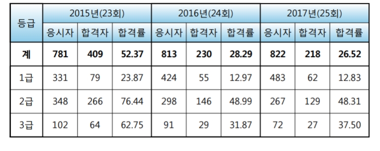청소년지도사 3년(15~17년) 응사자, 합격자 인원 및 합격률입니다.