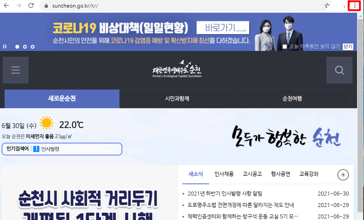 3. "순천시청 홈페이지" 에 접속하여 오른쪽 상단에 보시면 "점 3개"를 누릅니다.