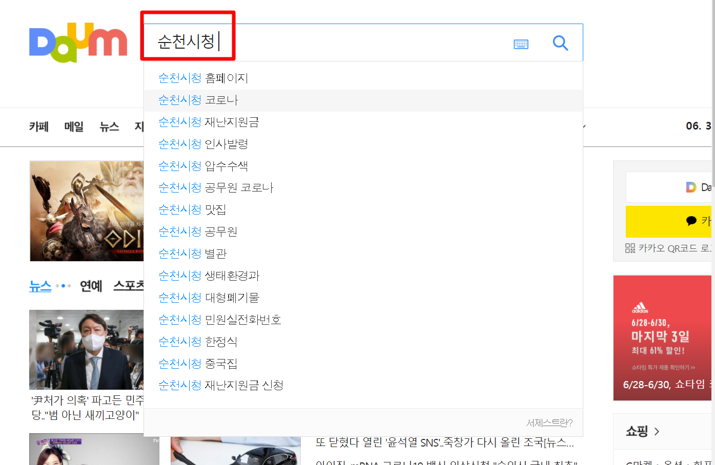 1. 다음(daum)검색창에 "순천시청 홈페이지 바로가기"를 검색합니다.