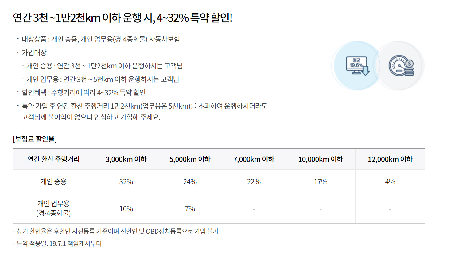 마일리지 할인은 연간 이동거리를 기준으로 하여 할인을 해주는 혜택으로 자세한 할인내역은 다음과 같습니다.
