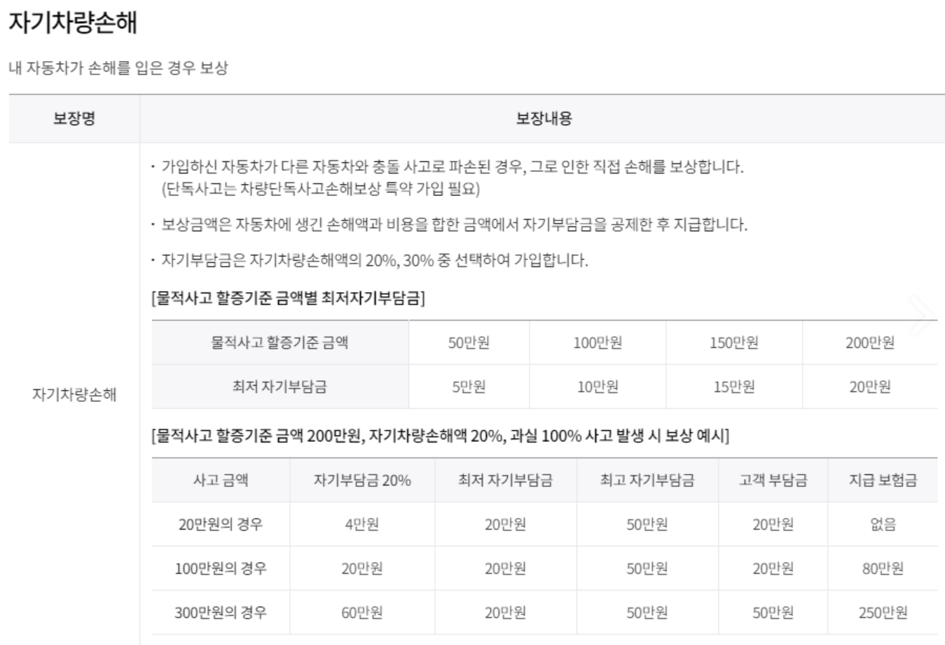 5. 본인의 자동차에 대하여 손해를 입은 경우 보장내용입니다.