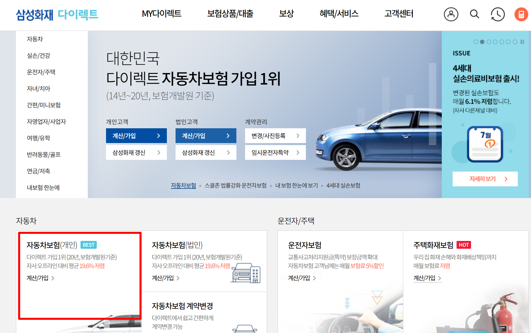2. 삼성화재 다이렉트 자동차보험 홈페이지에 접속하시면 왼쪽 아래를 보시면 자동차보험(개인)을 누르셔서 계산하시면 가입을 하시면 됩니다.
