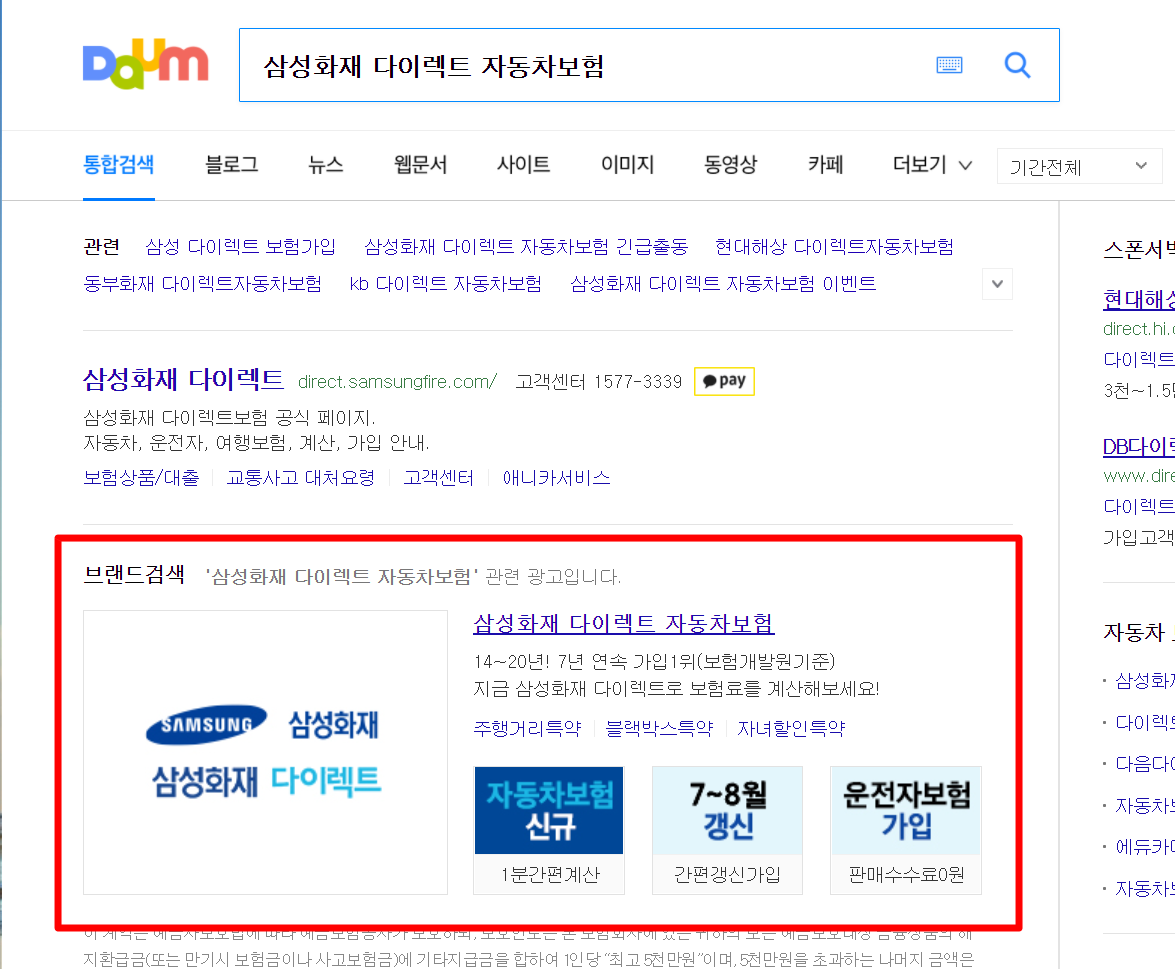 1. 다음(daum)검색창에 "삼성화재 다이렉트 자동차보험 가입방법"을 검색합니다.