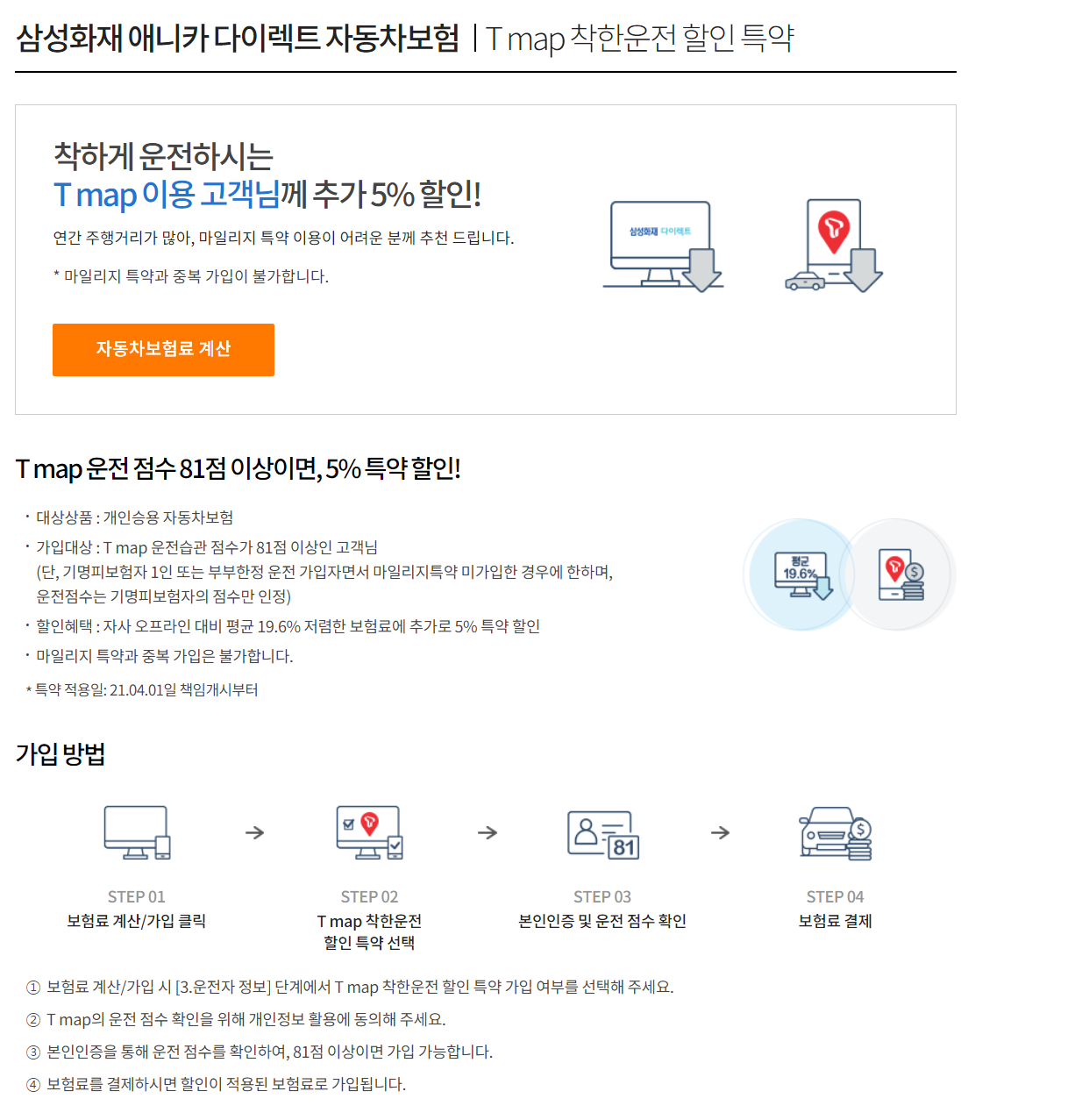 T map 착한운전 할인 특약은 T map 어플을 설치하여 연간 주행거리를 충족할 시 5%를 할인하여 주는 특약입니다. T map 운전습관 점수가 81점 이상이어야 합니다. 자세한 가입 방법 및 설명은 아래와 같습니다.
