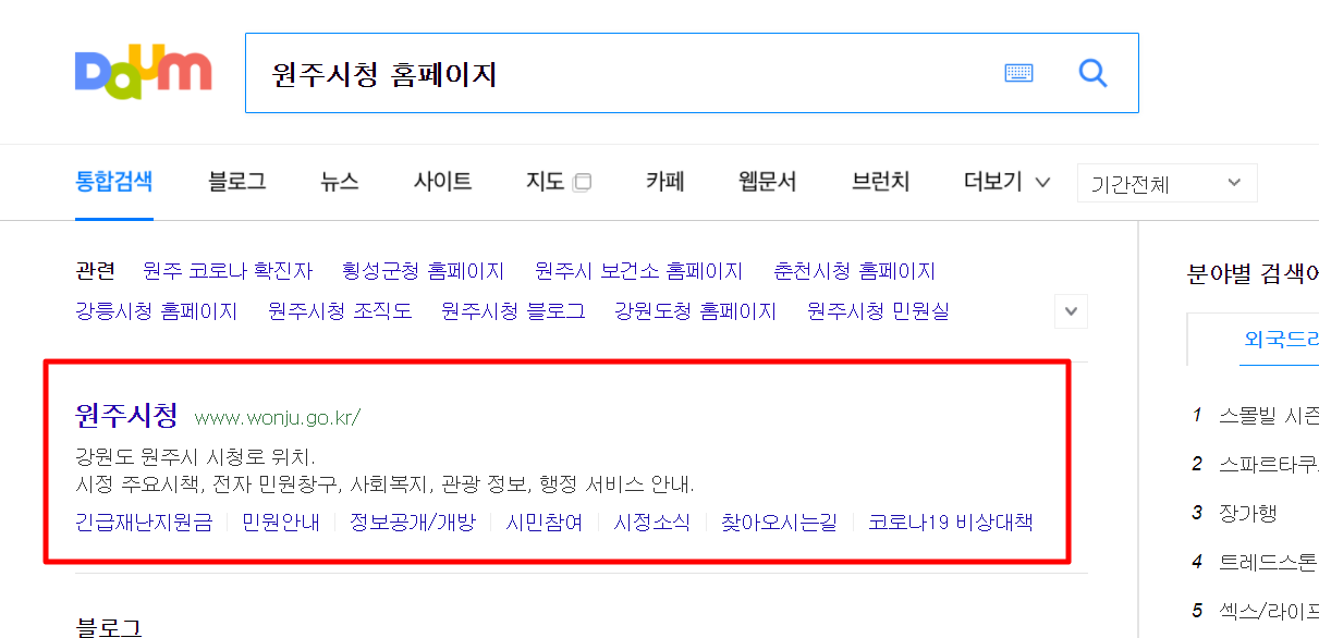 1. 다음(daum)검색창에 "원주시청 홈페이지 바로가기"를 검색합니다.