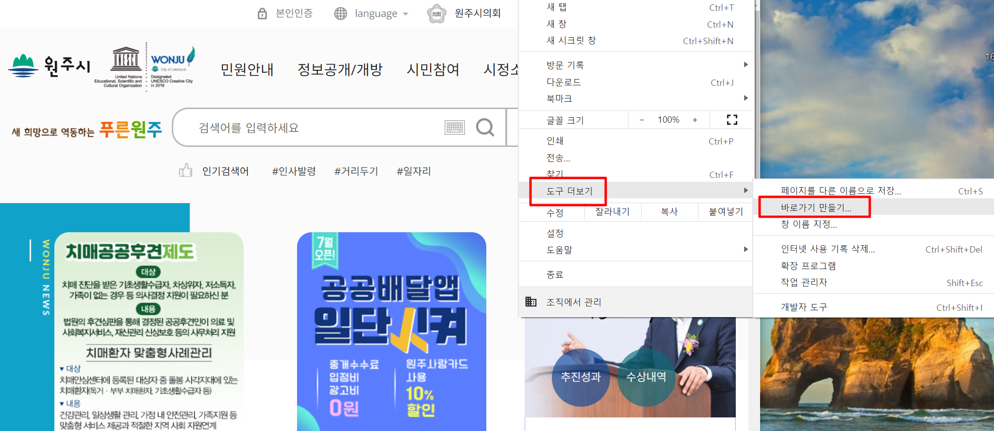 6. 바탕화면에 "원주시청" 홈페이지 아이콘이 뜹니다. 원주시청 홈페이지 아이콘만 누르시면 원주시청 홈페이지에 쉽게 접속을 하실 수 있습니다. 그리고 시정 주요 시책, 전자 민원창구, 사회복지, 관광 정보, 행정 서비스 안내, 정보공개 등을 이용하실 수 있습니다.