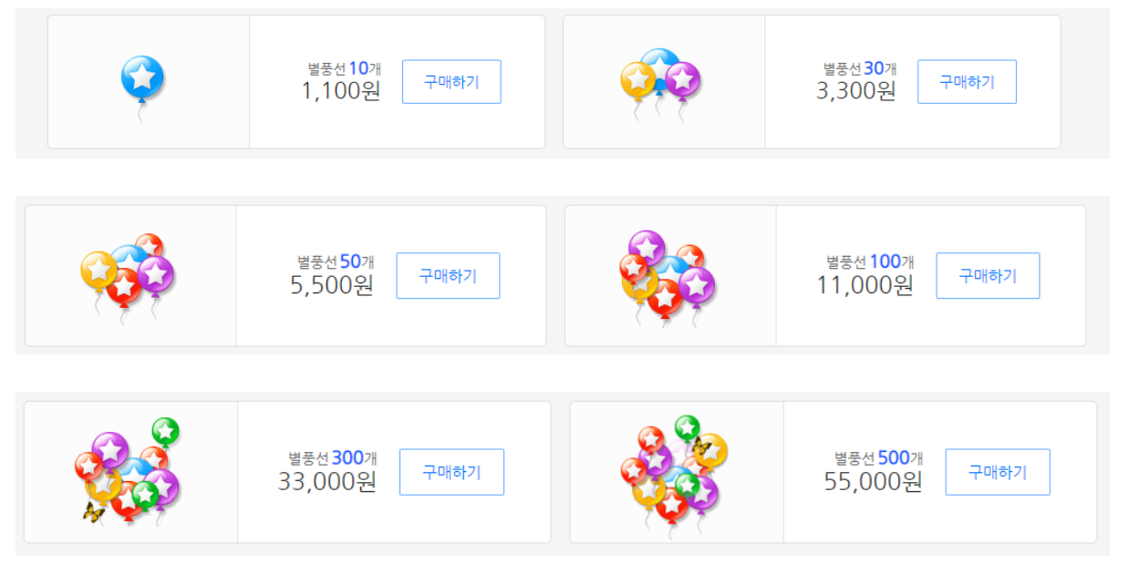 아프리카tv 별풍선 가격은 1개당 110원(부가세 10% 포함)입니다. 10개, 30개, 50개, 100개, 300개, 500개 단위로 별풍선 구매를 하실 수 있습니다.