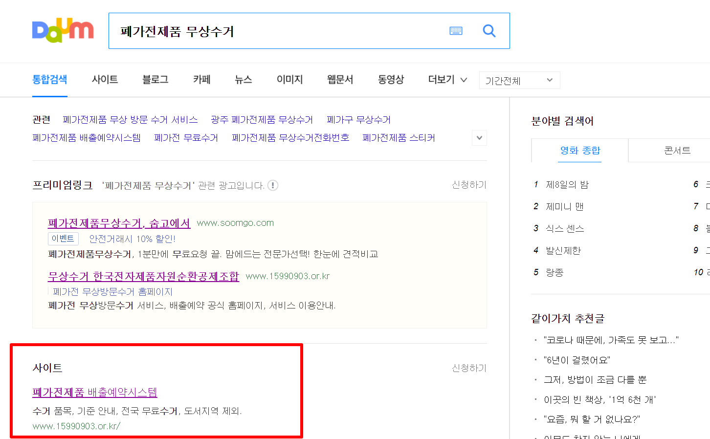 1. 다음(daum) 검색창에 "폐가전제품 무상수거" 또는 "폐가전 배출예약시스템"을 검색합니다.