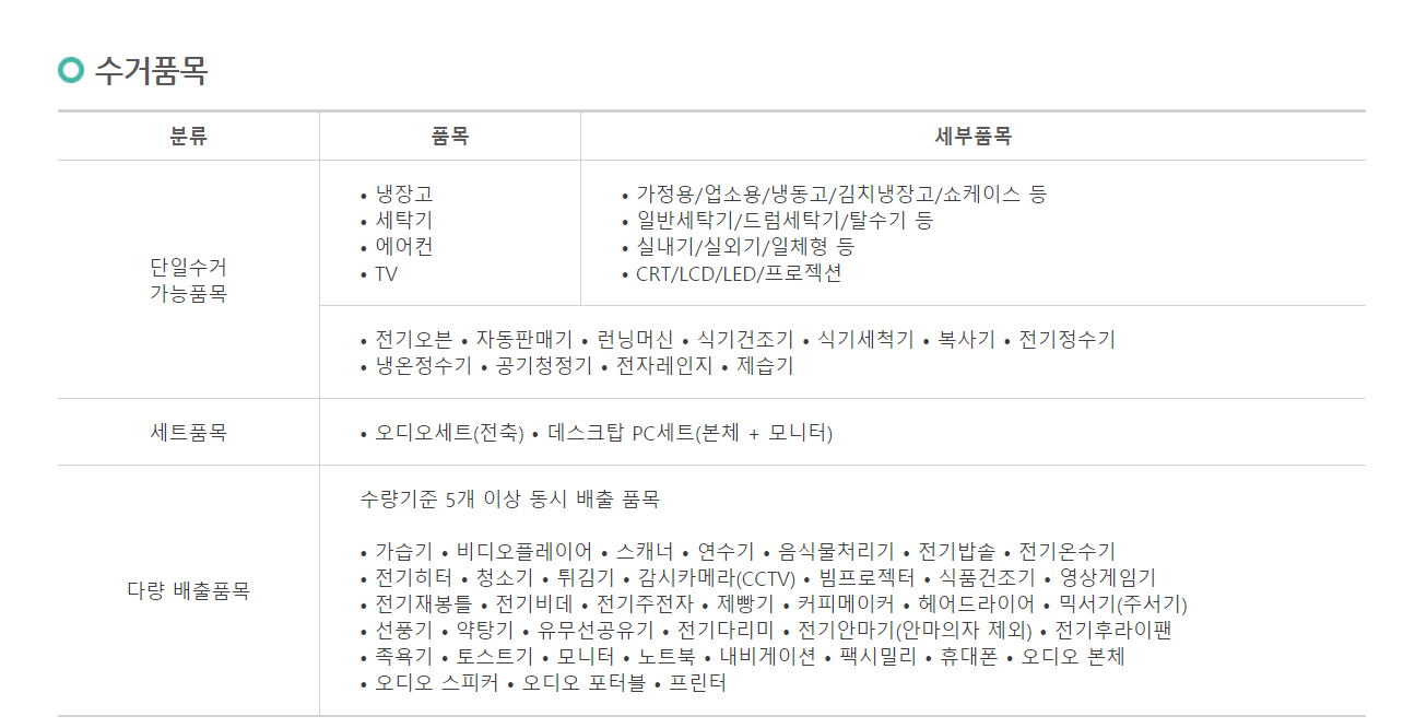 폐가전제품 무상방문수거 수거 기준입니다. 수거불가 품목도 있으니, 잘 확인하셔서 예약 신청하세요.