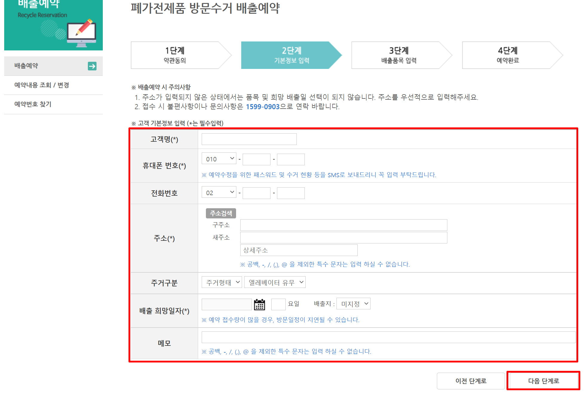 4. 고객명, 휴대폰 번호, 주소, 주거 구분, 배출 희망일자, 메모 등을 기록하시고 다음 단계를 누릅니다.
