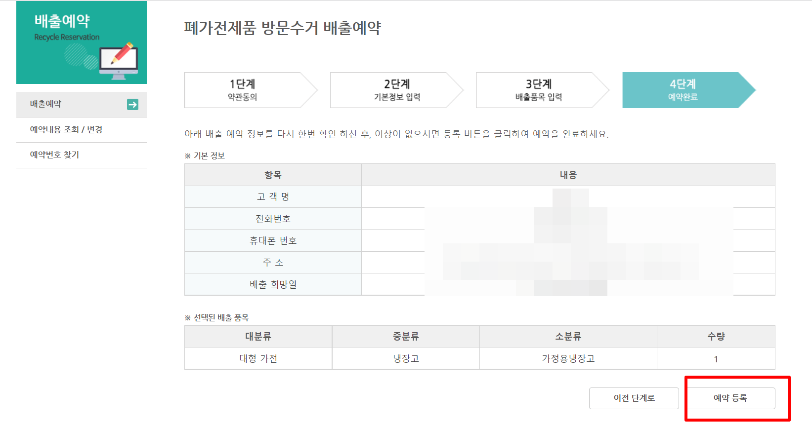 6. 마지막 4단계에서 입력하신 내용들을 확인하시고, 맞으면 예약등록을 누르시면 예약이 완료됩니다.